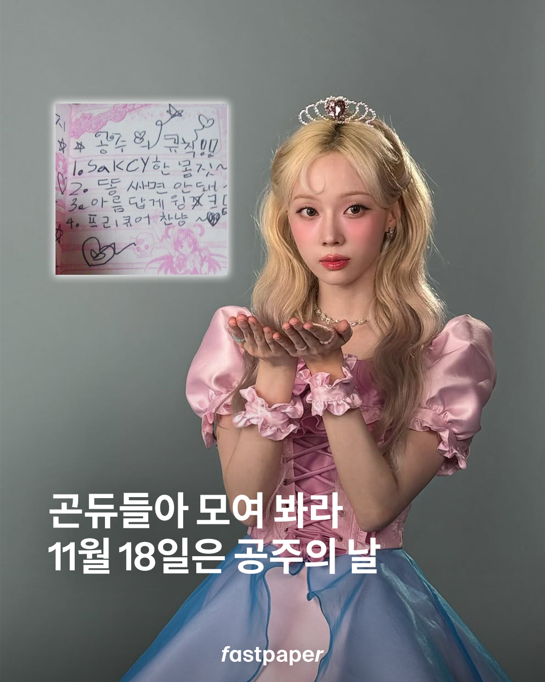 전세계 다양한 기념일을 알려주는 사이트 ‘Days of the Year’에 따르면, 매년 11월 18일은 공주의 날입니다. 공주의 날은 백조 공주를 탄생시킨 네스트 엔터테인먼트가 아이들의 풍부한 상상력을 구현하기 위해 만들었는데요. 오늘만큼은 모든 이들이 친절하고 용기 있는 공주처럼 살면 된다는 것. 주변 공주님들 소환하자… 잘 모시거라… 대대손손 내려오는 ‘공주의 철칙’도 잊지마세요…^^*