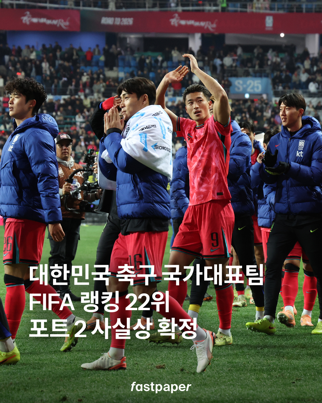 국제축구연맹 FIFA가 오늘 공개한 FIFA랭킹에 따르면 대한민국 축구대표팀이 22위를 기록했습니다. 이는 지난달과 같은 순위로, 다음 달 진행되는 월드컵 본선 조 추첨에 활용될 예정인데요.