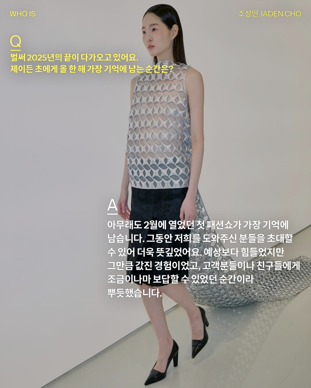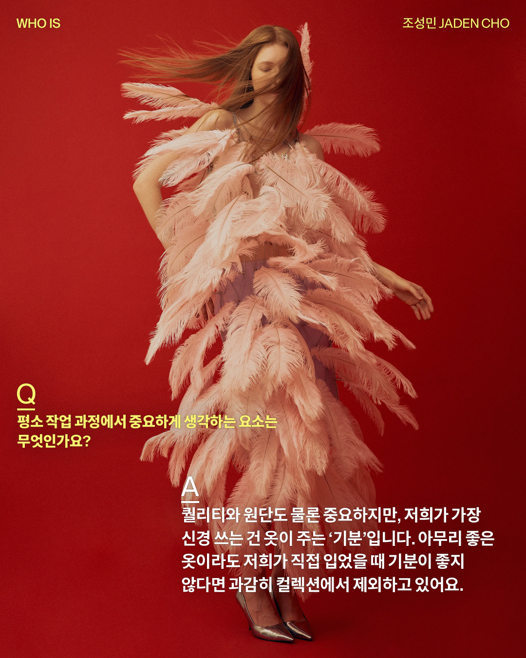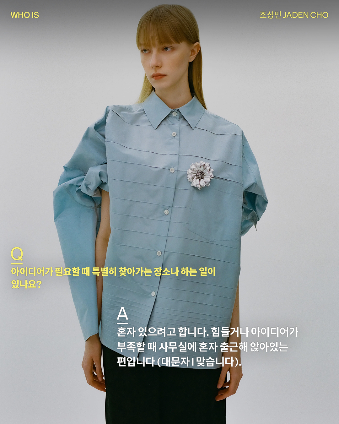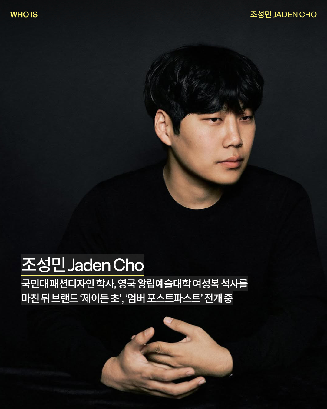 지금 주목해야 할 국내 디자이너죠. 국민대 패션디자인, 영국 왕립예술대학 졸업 후 2021년 에 브랜드 제이든 초와 엄버 포스트파스트를 전개 중인 조성민을 만났습니다.