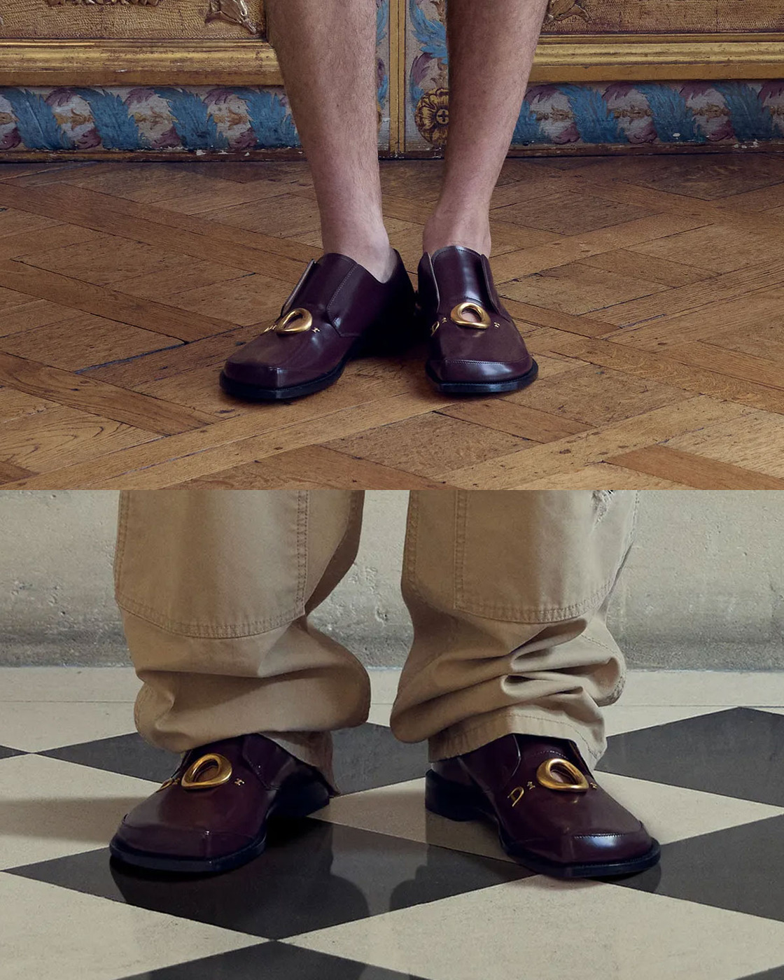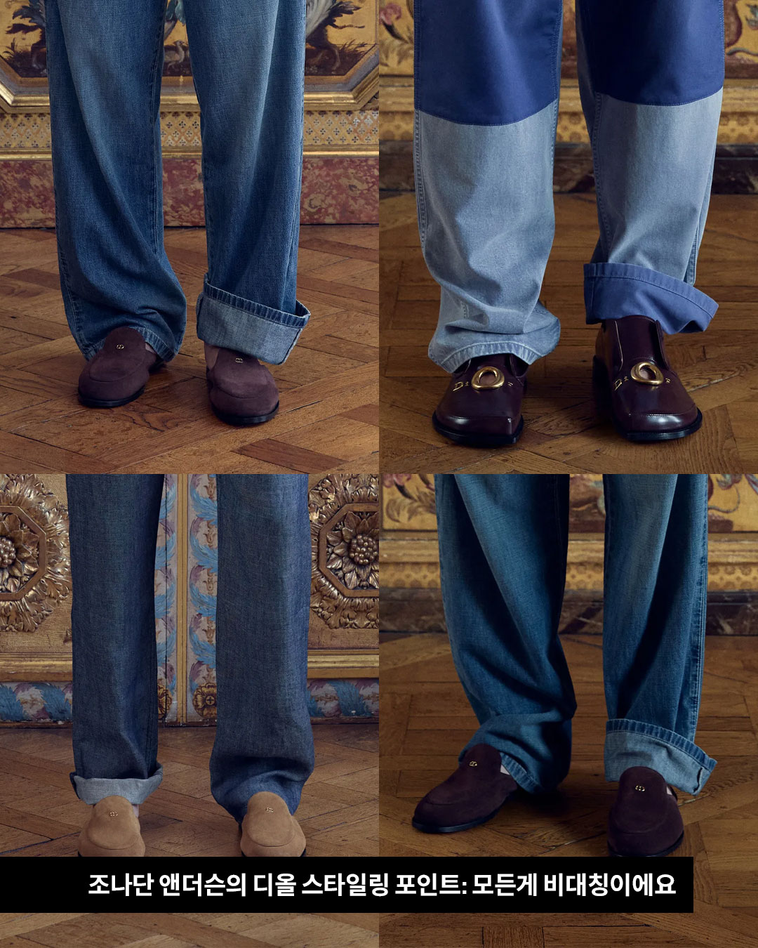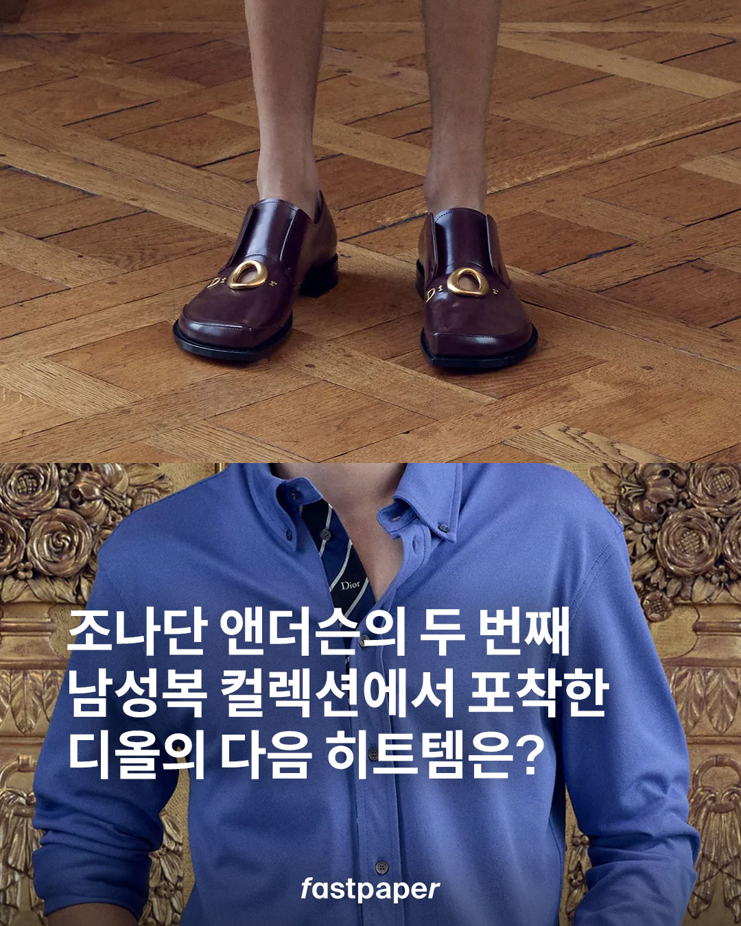 먼저 지난 시즌에도 등장했던 NEW 디올 로고 벨트, 그리고 O 모양에 따라 펀칭된 로고 로퍼가 있고요. 최근 화제됐던 북 토트에 이어 등장한 <배고픈 애벌레> 니트 스웨터까지 등장했습니다. 여기에 플래킷 안쪽에 숨겨진 로고 디테일과 비대칭 스타일링이 더해져, 조나단 앤더슨은 이번에도 역시 구매욕을 제대로 자극하네요.