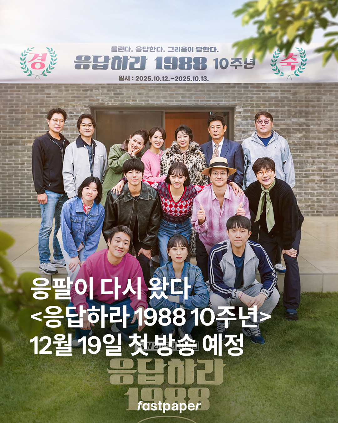 응팔 쌍문동 식구들이 돌아왔습니다. 12월 19일 첫 방송 예정인 프로그램은 1박 2일 동안 10주년 기념 MT를 떠난 이야기를 담았는데요. 성동일, 이일화, 라미란, 혜리, 박보검 등 10년 전 포스터 그대로 재현해 화제를 모으고 있죠. <응답하라 1988 10주년>은 총 3회 분량으로 제작되어 전 세계 응팔 팬들을 만날 예정입니다.