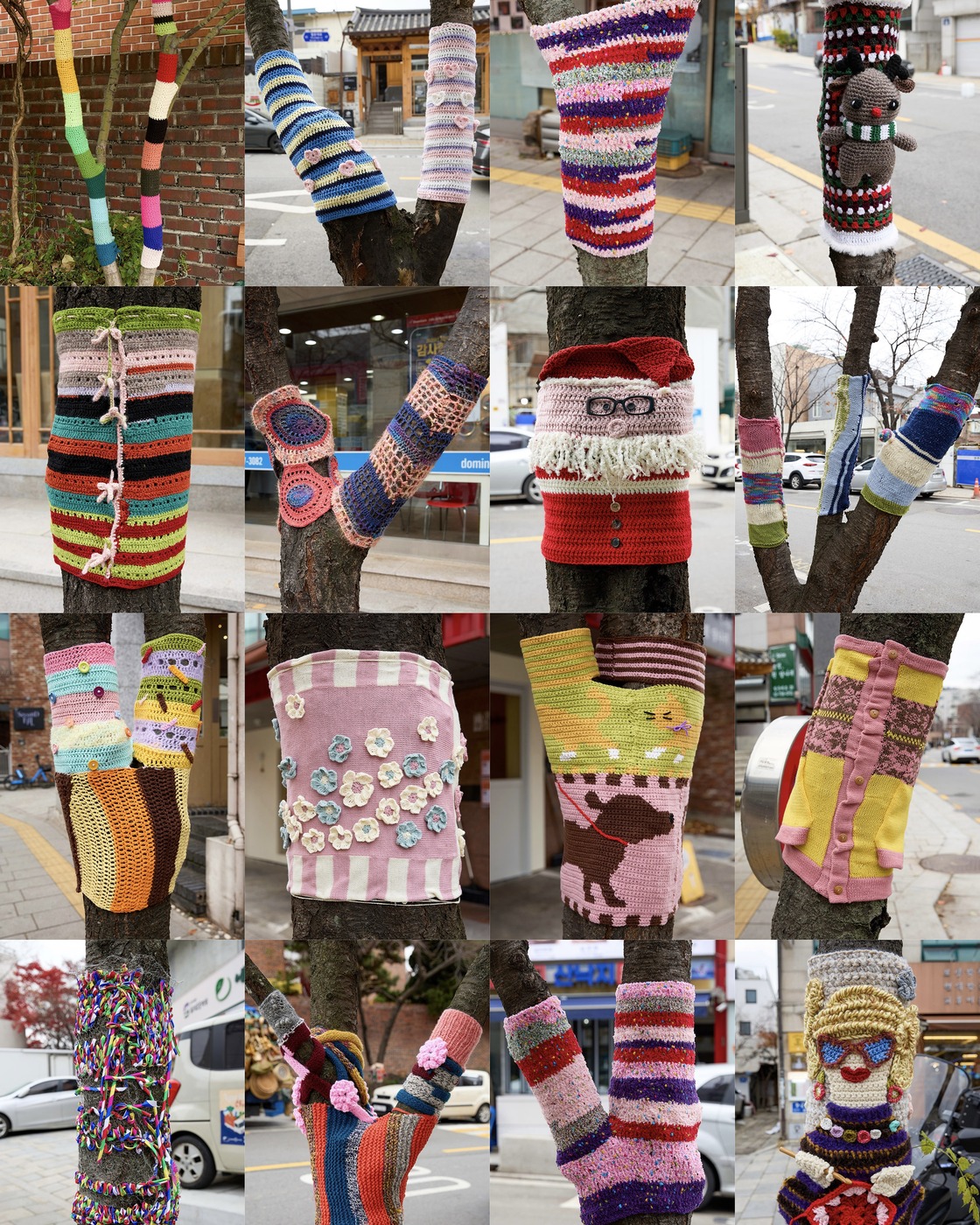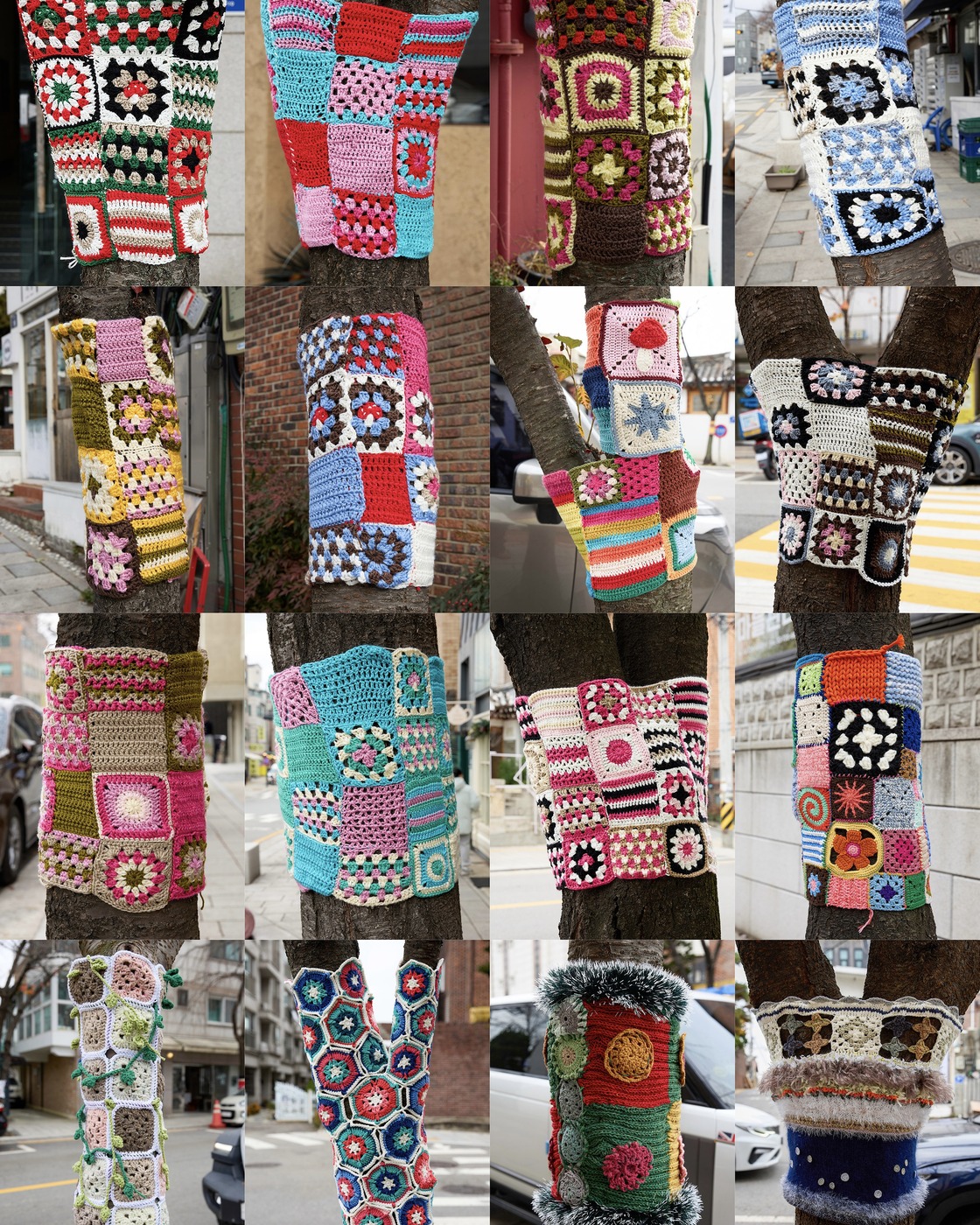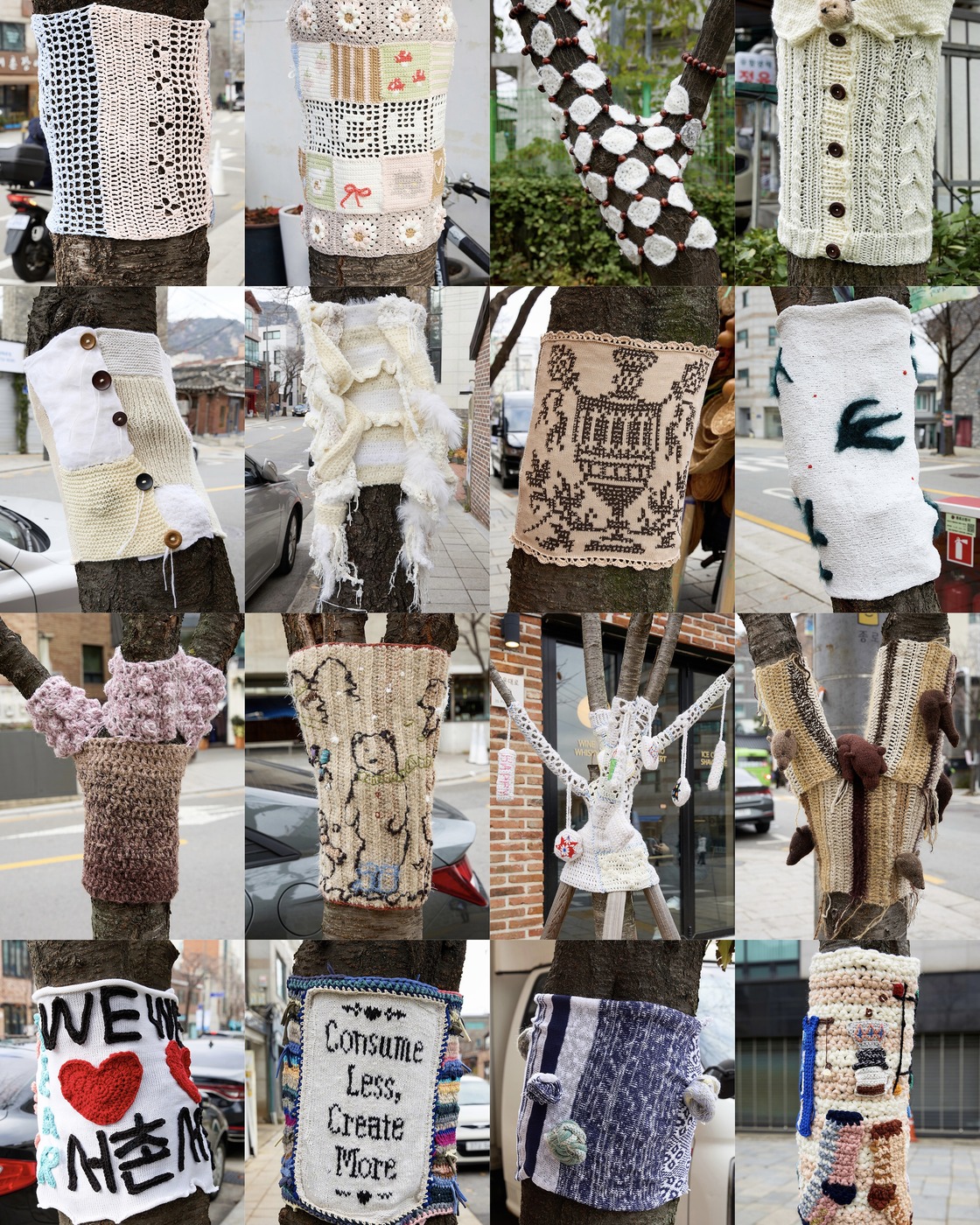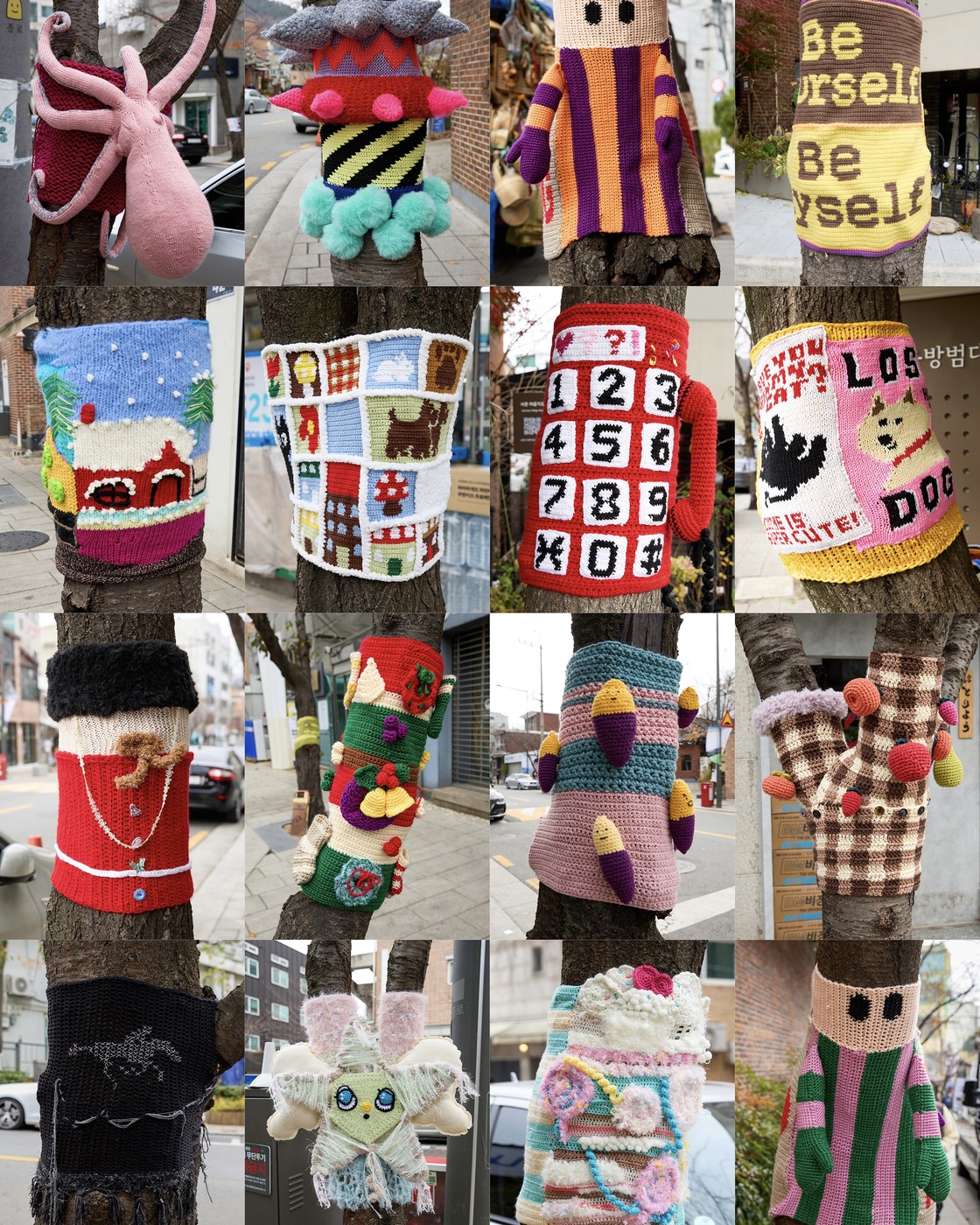 나무나 거리를 털옷으로 꾸미는 공공예술, ‘서촌 얀바밍‘ 전시가 지난 주말부터 시작됐습니다. 시네코 스튜디오 @sinekostudios와 댄싱그랜마 @dancing.randma 가 함께한 이번 프로젝트는 134명의 작업자가 모여 78그루의 가로수에 뜨개 옷을 입혀주었죠.