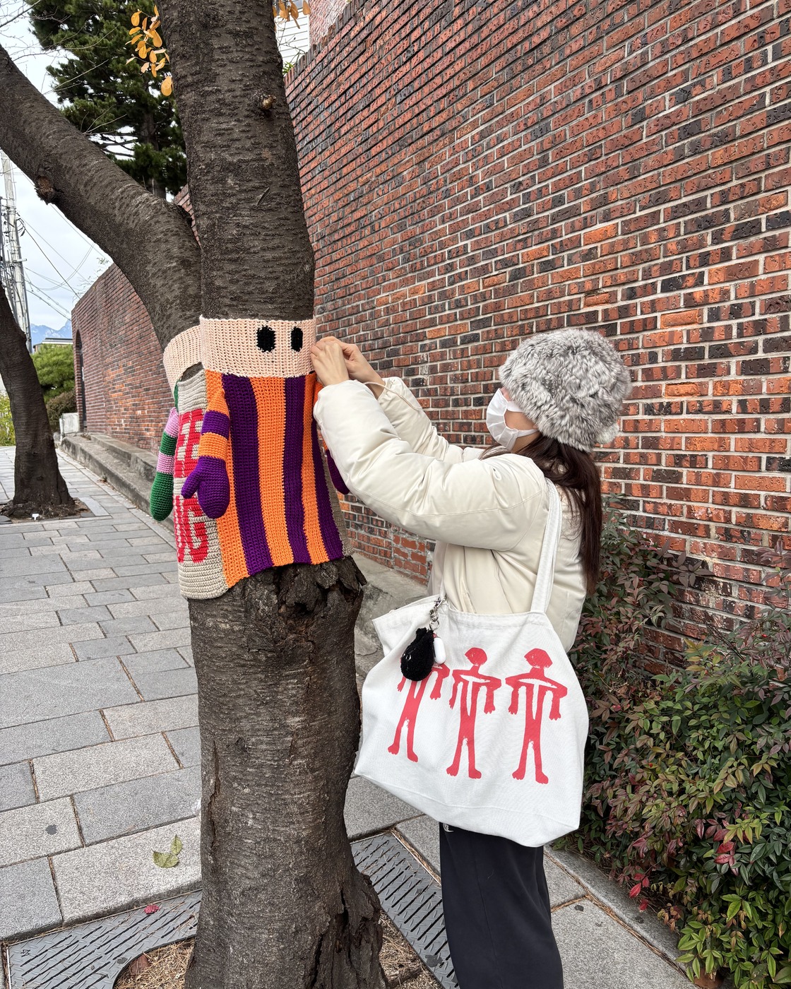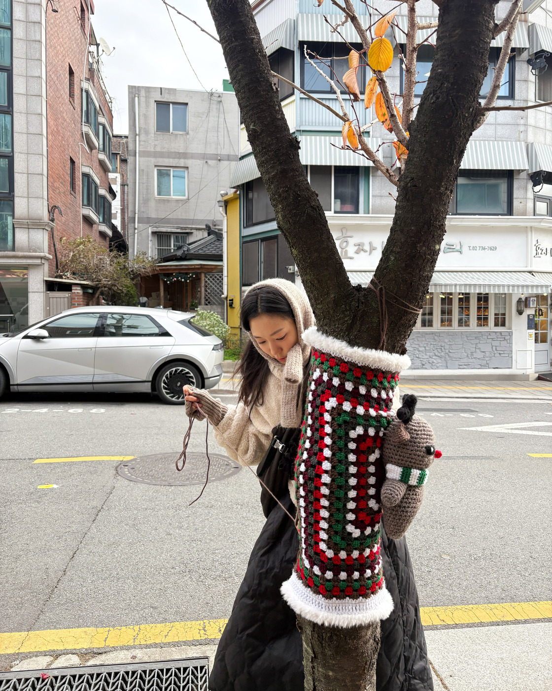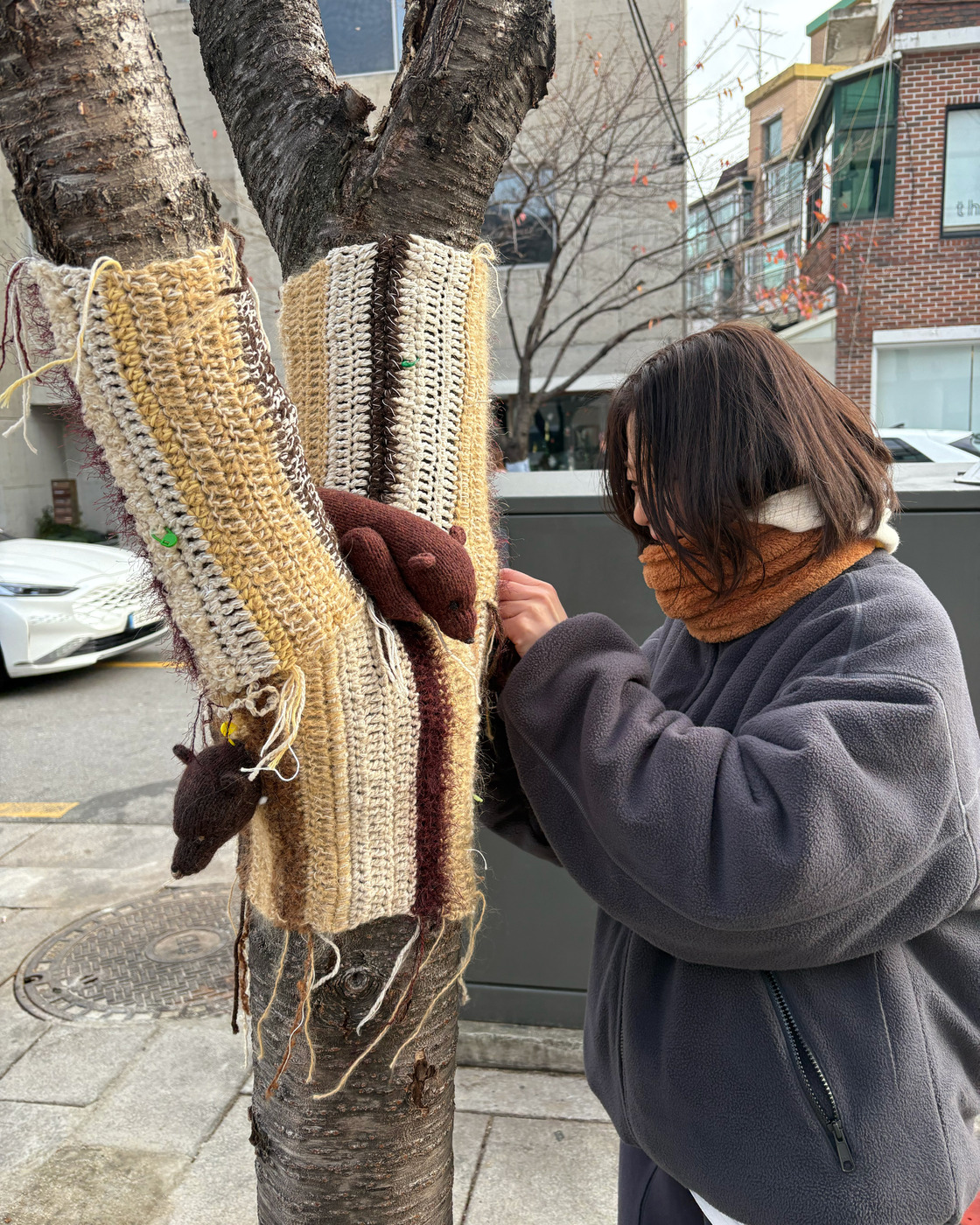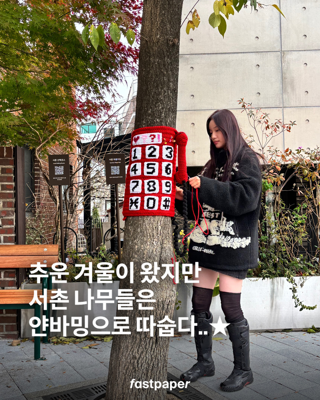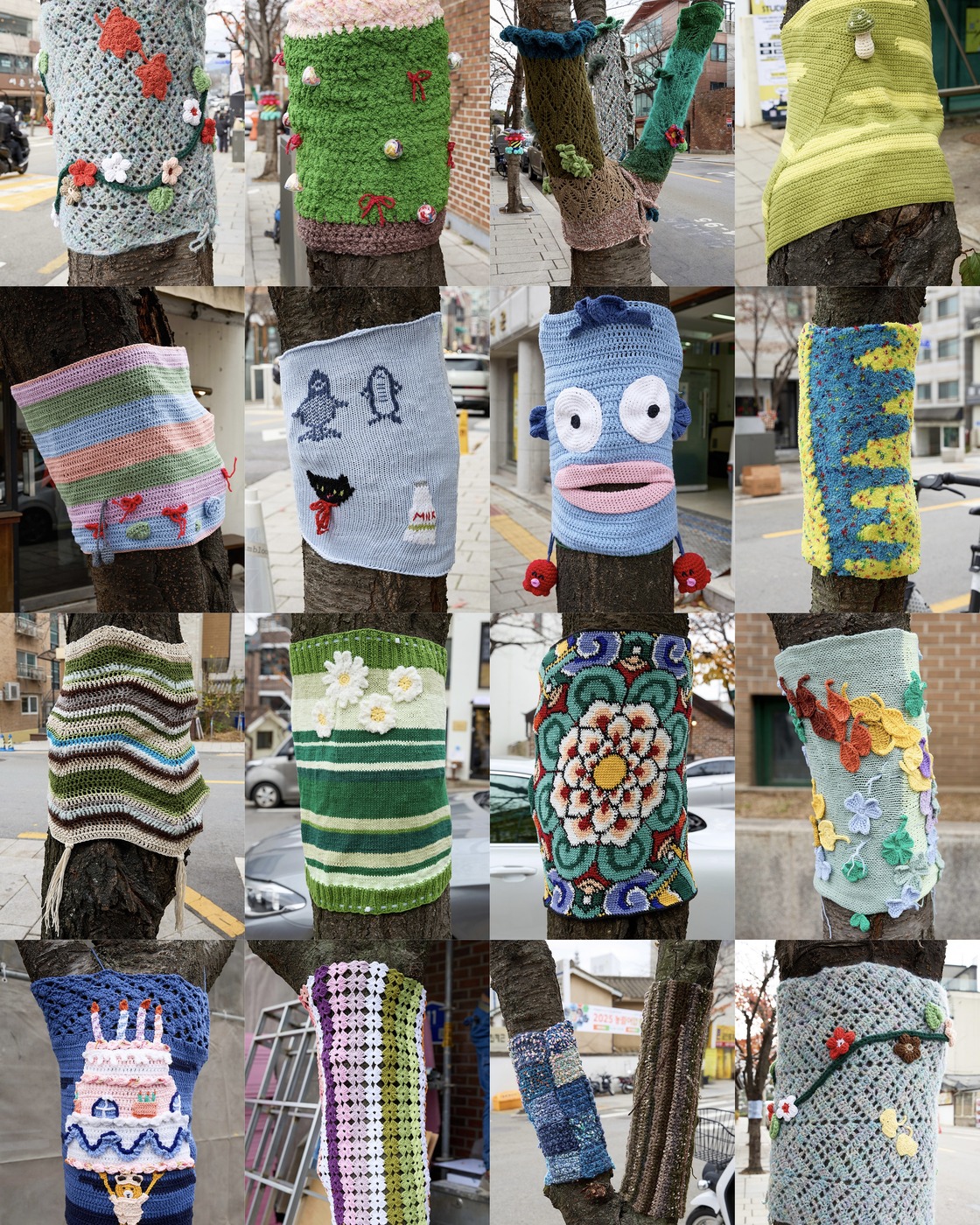 나무나 거리를 털옷으로 꾸미는 공공예술, ‘서촌 얀바밍‘ 전시가 지난 주말부터 시작됐습니다. 시네코 스튜디오 @sinekostudios와 댄싱그랜마 @dancing.randma 가 함께한 이번 프로젝트는 134명의 작업자가 모여 78그루의 가로수에 뜨개 옷을 입혀주었죠.