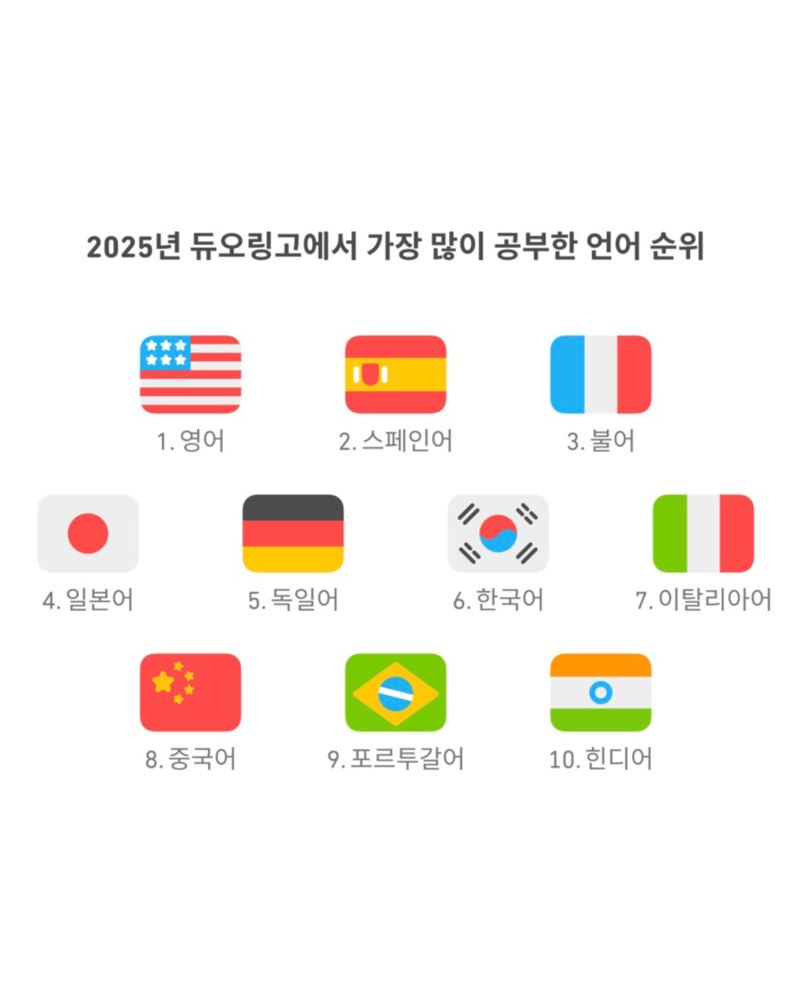 듀오링고가 발표한 2025 언어 보고서에서 올해 전 세계에서 가장 많이 공부한 언어 순위 6위에 한국어가 올랐습니다. 지난 해 보다 한 단계 상승한 순위죠. 또한 프랑스, 독일, 스페인 등 여러 국가에서 두 번째로 빠르게 성장한 언어로 꼽히며 성장세에서도 두드러진 모습을 보였는데요.