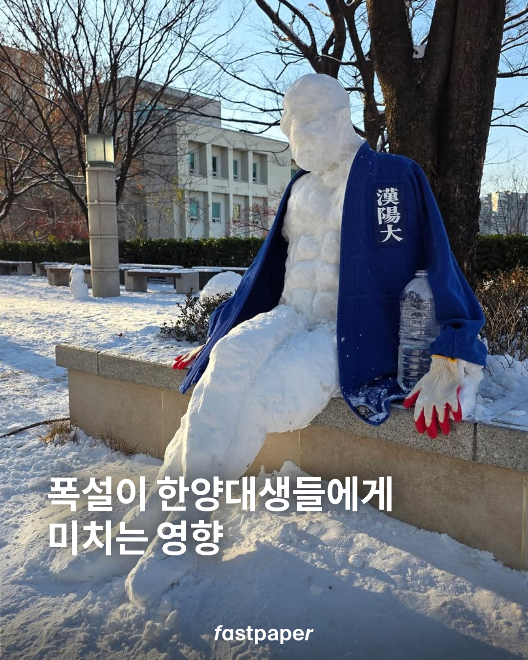 세상에 금손 아니 눈손은 어디에나 있다… 지난주에 내린 첫눈이 한양대생에게 미치는 영향은 이렇습니다. 한양대 백남학술정보관의 연구정보팀이 촬영한 눈사람을 소개합니다. A.k.a. ‘유도하는 사람(2025)‘은 진짜 사람같은 실루엣과 섬세한 복근이 포인트. 밤에 마주치면 깜짝 놀랄 수도 있겠어요. 눈이 마저 녹기 전, 유도하는 눈사람 보러 한양대에 방문해 보세요.