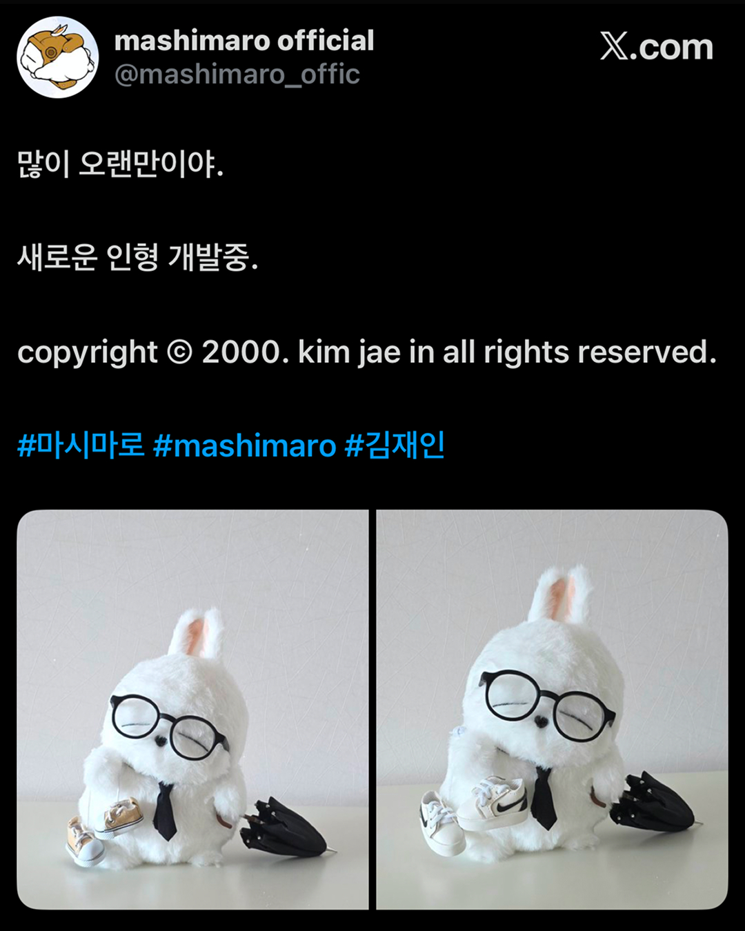 2000년대 초를 풍미했던 마시마로 캐릭터. 한국의 김재인 작가가 탄생시킨 토끼 캐릭터 마시마로가 오랜만에 돌아왔습니다. 공식 X 와 인스타그램 계정엔 ‘많이 오랜만이야, 새로운 인형 개발 중’ 이라는 말과 어딘가 많이 지쳐(?) 보이는 마시마로의 모습이 보이죠.
