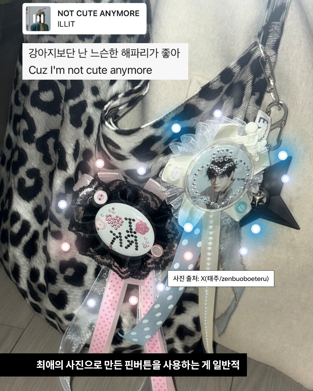 최애의 얼굴 사진을 핀 버튼으로 만들어서 사용하는 게 일반적이고, 위 사진처럼 미니 CD를 넣거나 다른 굿즈를 활용해도 좋을 것 같네요.