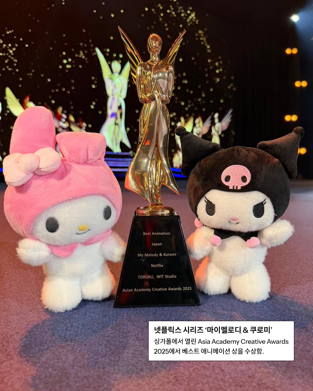 넷플릭스 시리즈 ‘마이멜로디 & 쿠로미’의 디렉터인 토모키 미사토가 공개한 이 사진! 싱가폴에서 열린 아시아 아카데미 크리에이티브 어워즈 2025에 참석한 이들의 모습을 소개합니다. 작고 소중한 ‘마이멜로디 & 쿠로미’의 주인공들은 여느 배우들처럼 레드카펫에 당당히 섰는데요.