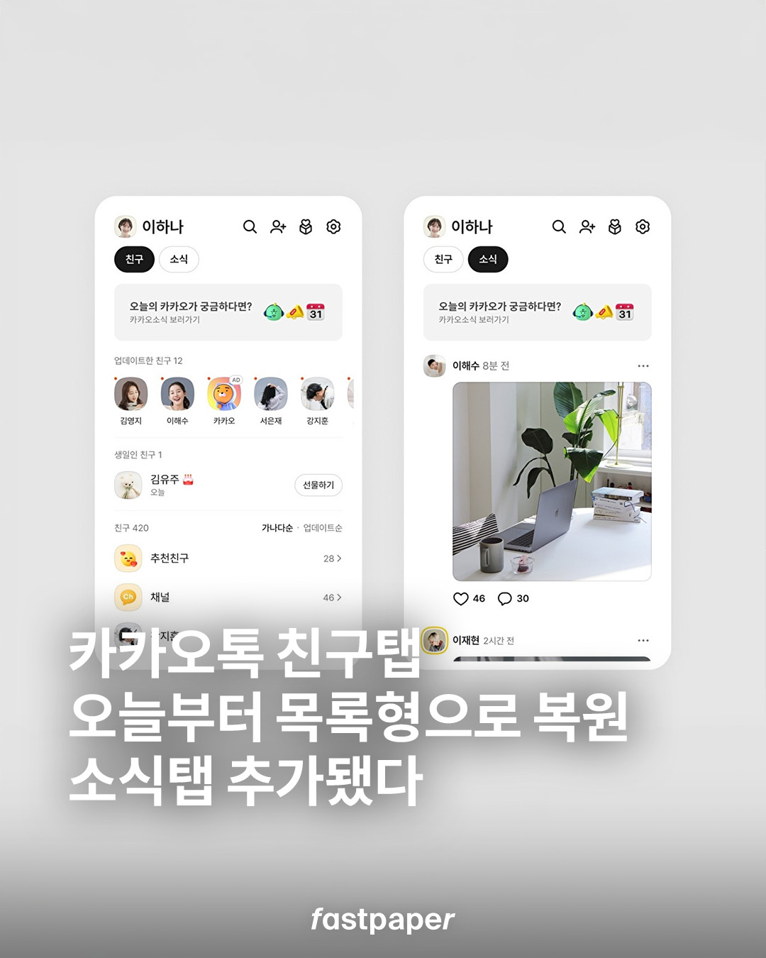 카카오가 오늘 업데이트를 통해 카카오톡 친구탭을 과거의 목록형 구조로 복원했습니다. 친구 목록이 기본 화면으로 노출되며, 상단에는 ‘친구’와 ‘소식’ 두 가지 옵션이 분리돼 제공되는데요.