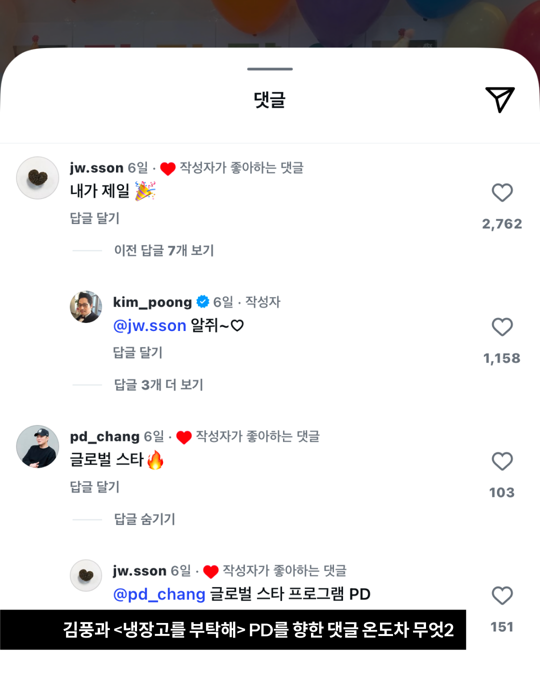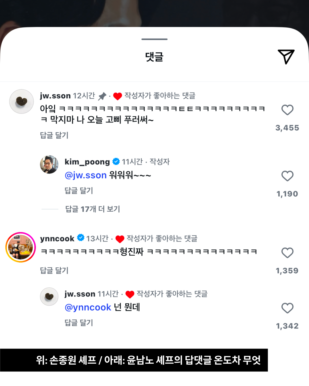 사랑은 숨길 수 없다고 하나요. 김풍의 응원 글에 댓글이 주목을 받고 있습니다. 냉부에 함께 출연 중인 윤남노 셰프에게는 한없이 차가운 그, PD에게도 차가운 남자이지만 오로지 풍며든 손종원 셰프는 김풍밖에 모르는 것 같아요.