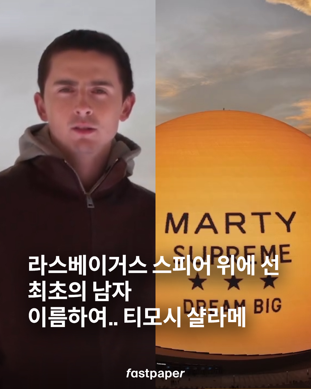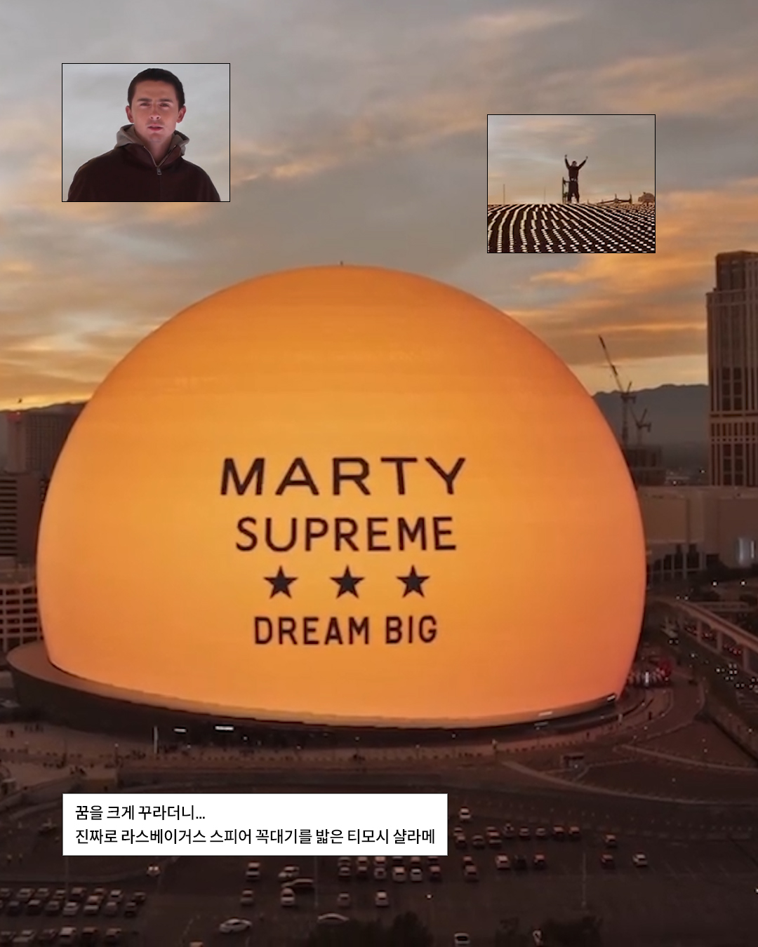 ‘꿈을 크게 꾸라(DREAM BIG)’라는 말을 이렇게까지 실천 잘 하는 사람이 또 있을까요. 신작 영화 홍보를 위해 티모시 샬라메가 선택한 무대는 다름 아닌 라스베이거스 스피어. 무려 그 꼭대기 위에 직접 올라섰습니다.