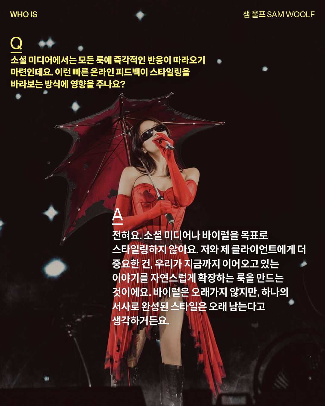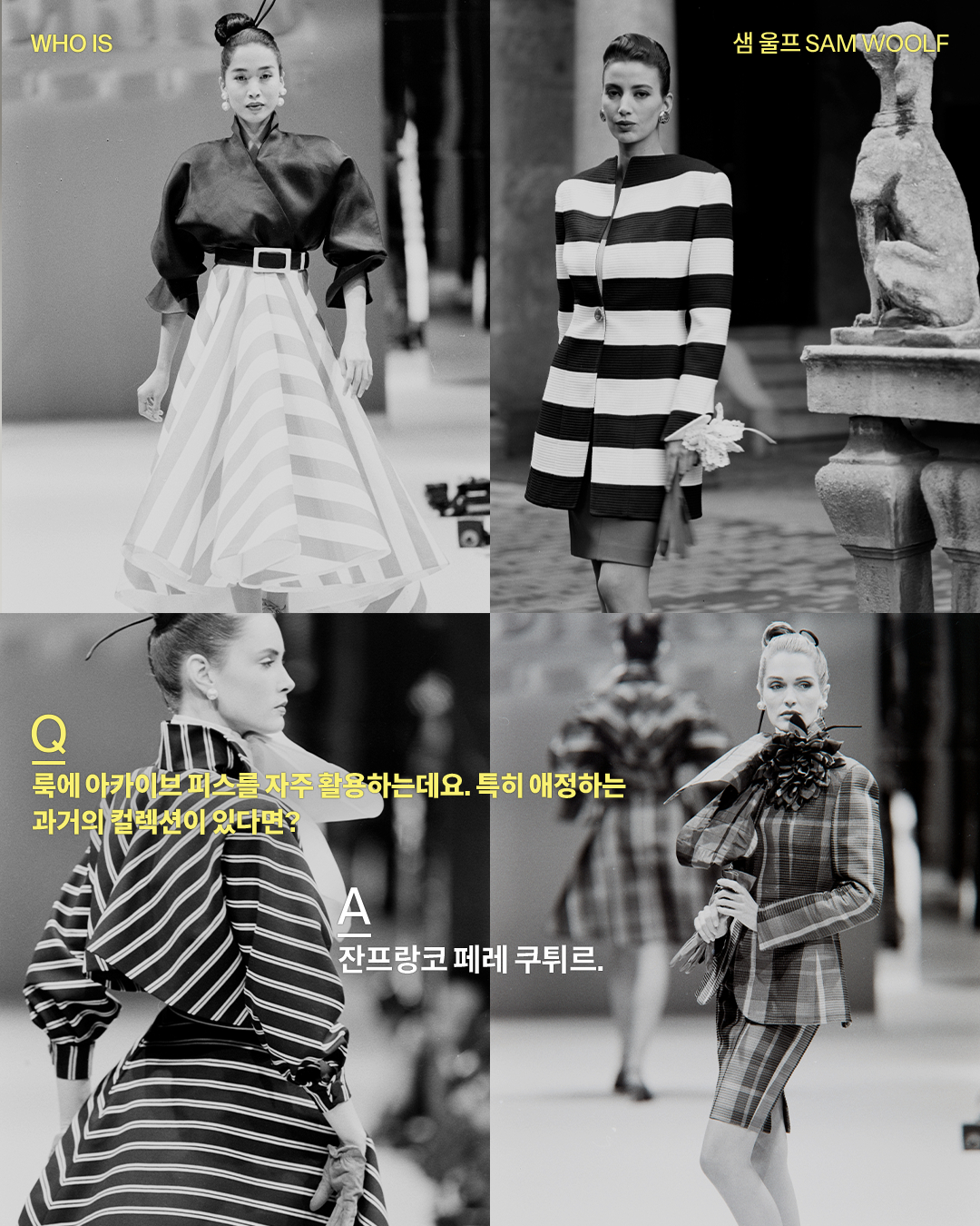 아티스트들과의 긴밀한 협업을 통해 아카이브 피스를 현대적으로 재해석하며 매번 강렬한 인상을 남기는 그는 과연 어떤 디자이너를 사랑하고, 룩을 어떻게 구상할까요? 슬라이드를 넘겨 샘 울프와의 인터뷰를 확인해 보세요.