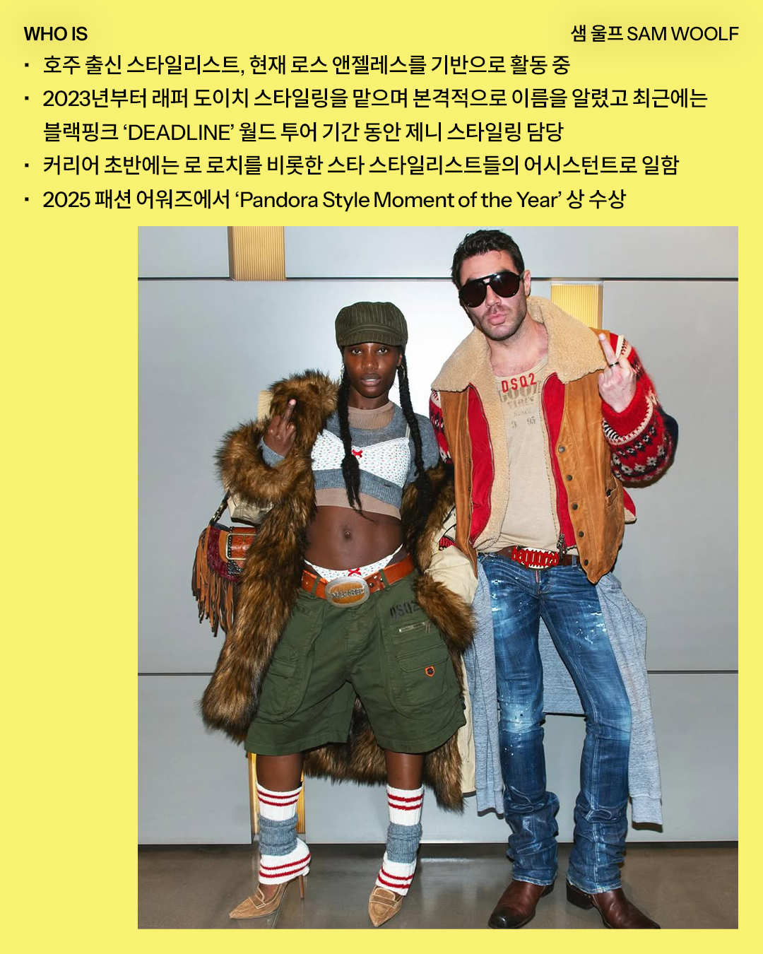 2023년부터 래퍼 도이치와 꾸준한 협업을 이어오며 무대, 뮤직비디오, 레드 카펫 등 스타일링으로 주목받고 있는 인물이죠. 최근에는 블랙핑크 ‘DEADLINE’ 월드 투어에 제니의 의상까지 맡으며 국내 브랜드 스탠드오일과 커스텀 부츠까지 제작한 스타일리스트, 샘 울프를 만났습니다.