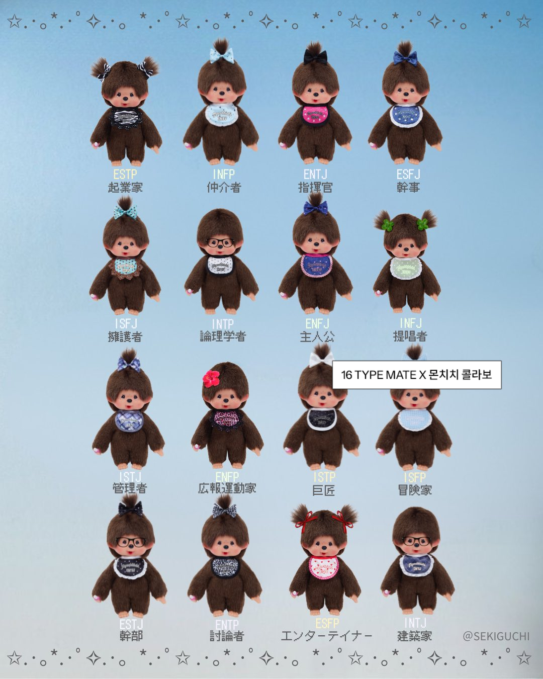 MBTI 성격 유형을 기반으로 캐릭터 및 굿즈, 컨텐츠를 만드는 일본의 16 TYPE MATE와 몬치치가 만났습니다. 각양각색으로 생긴 16가지 몬치치 턱받이에는 성격 유형에 맞는 MBTI가 새겨져 있죠. 논리적인 사색가인 INTP 몬치치는 머리 장식 없이 안경만 쓴 모습이 인상적입니다. 본인이나 최애의 성격 타입의 몬치치를 찾아보세요..
