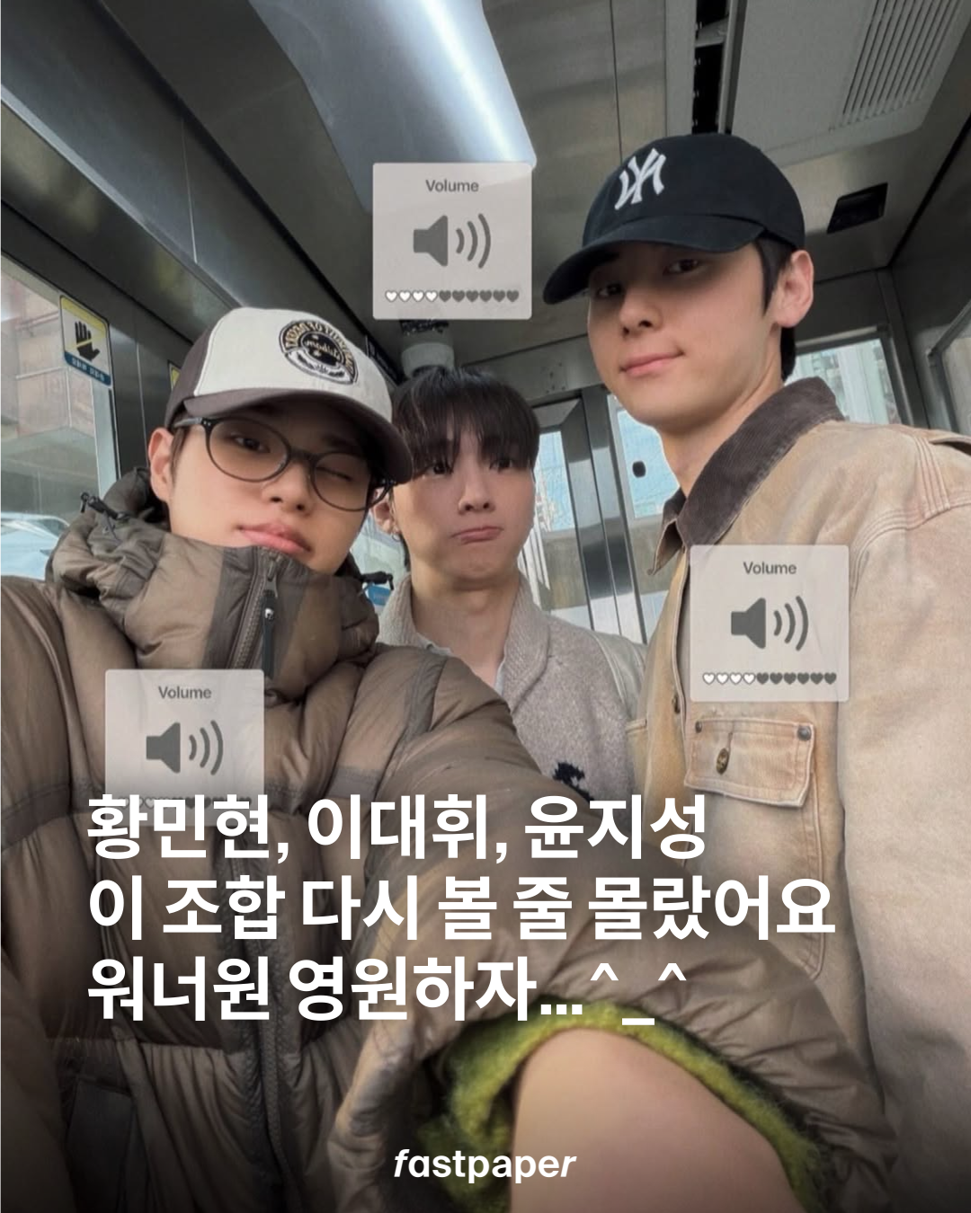 10년 전 요하이 좀 사모았다면 지금 당장 모이라고… 워너원의 황민현, 이대휘, 윤지성이 뭉쳤습니다. 오랜만에 모인 이 조합에 많은 팬들은 추억에 젖고 있는 중. 얼마 전 전역한 황민현, 각자의 위치에서 활발할 활동을 이어가고 있는 이대휘와 윤지성! 다음엔 완전체 만남 기대하고 있을게요…