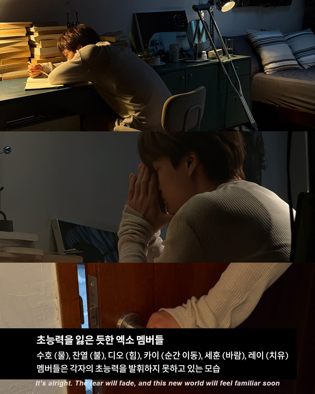 먼저 멤버들의 사진 속 문구들을 눈여겨볼까요? ‘It makes sense that it doesn’t fly the way I want… but somehow, it still feels strange’등의 문구들은 마치 멤버들이 초능력을 잃었단 뜻으로 해석됩니다. 불이라는 초능력을 가진 찬열이 화상을 입고, 순간 이동이라는 초능력을 가진 카이가 목발을 사용하는 등 이 전에 공개되었던 트레일러에서도 확인할 수 있었던 내용이죠.