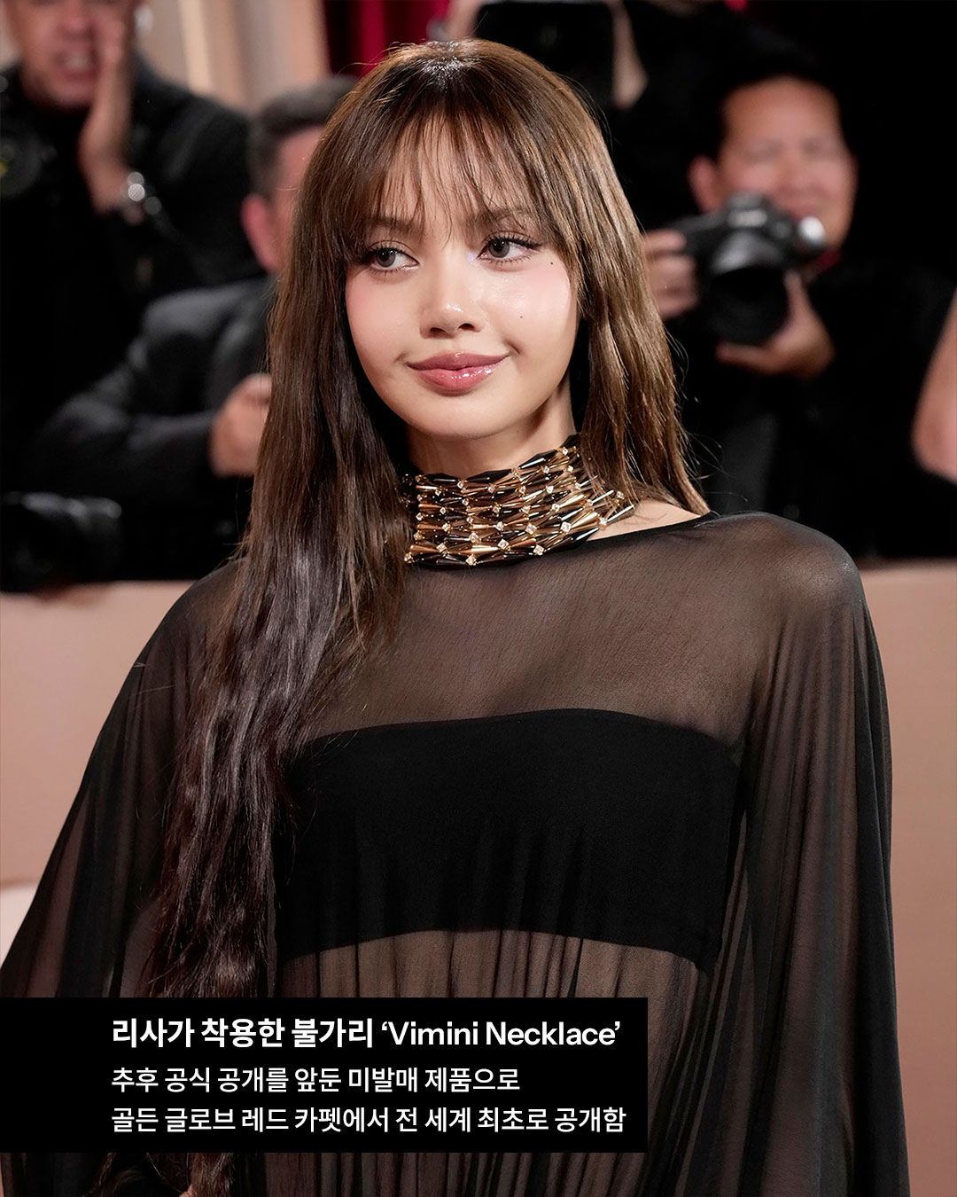 이게 바로 글로버 앰버서더의 기개야… 2026 골든 글로브 시상식에 시상자로 참석한 블랙핑크 리사의 레드 카펫 룩이 화제를 모으고 있습니다. 자크뮈스의 블랙 드레스를 입은 리사는 특별한 주얼리로 룩을 완성했는데요. 바로 불가리의 새로운 하이주얼리 컬렉션 ‘비미니(Vimini)’의 일부입니다.