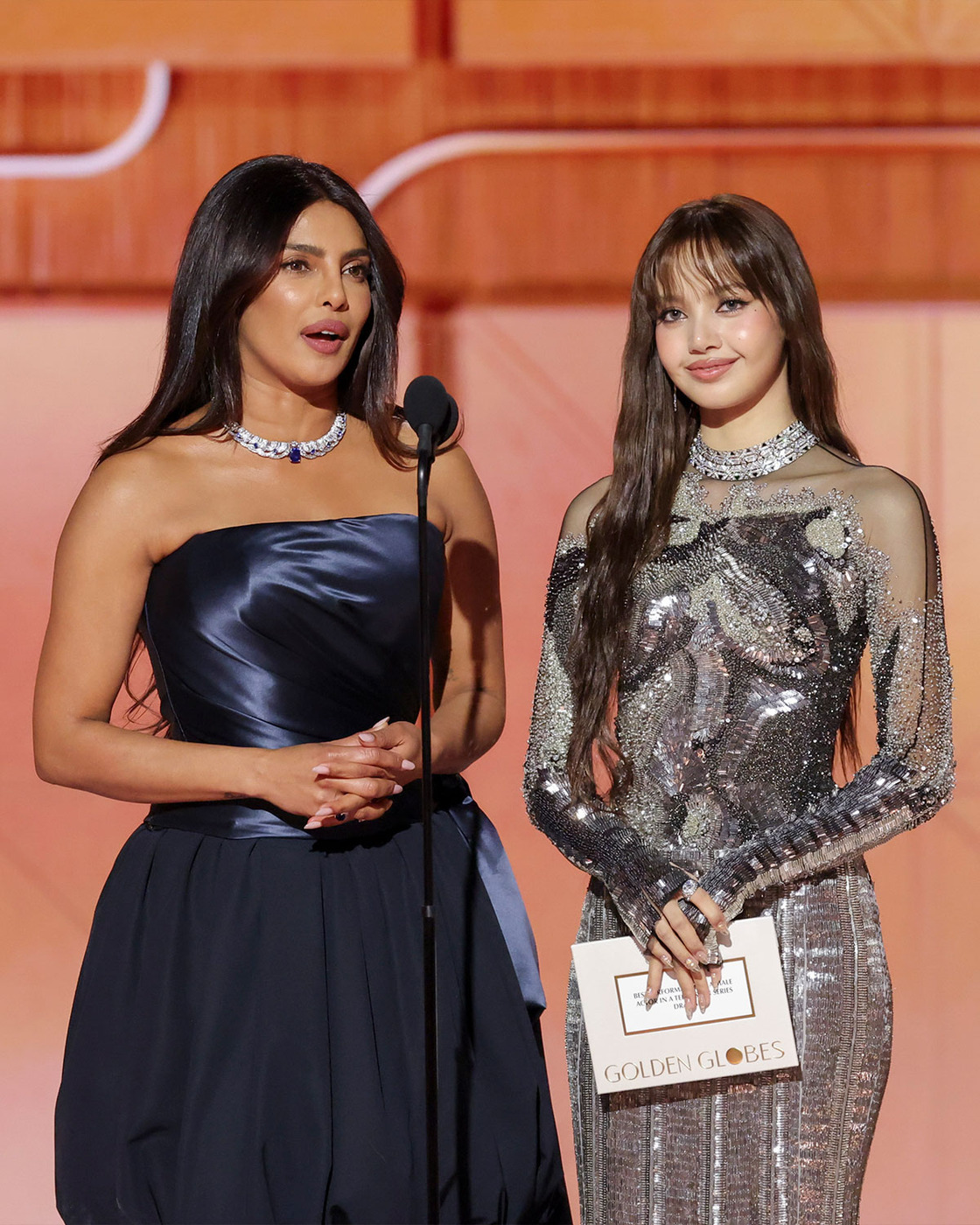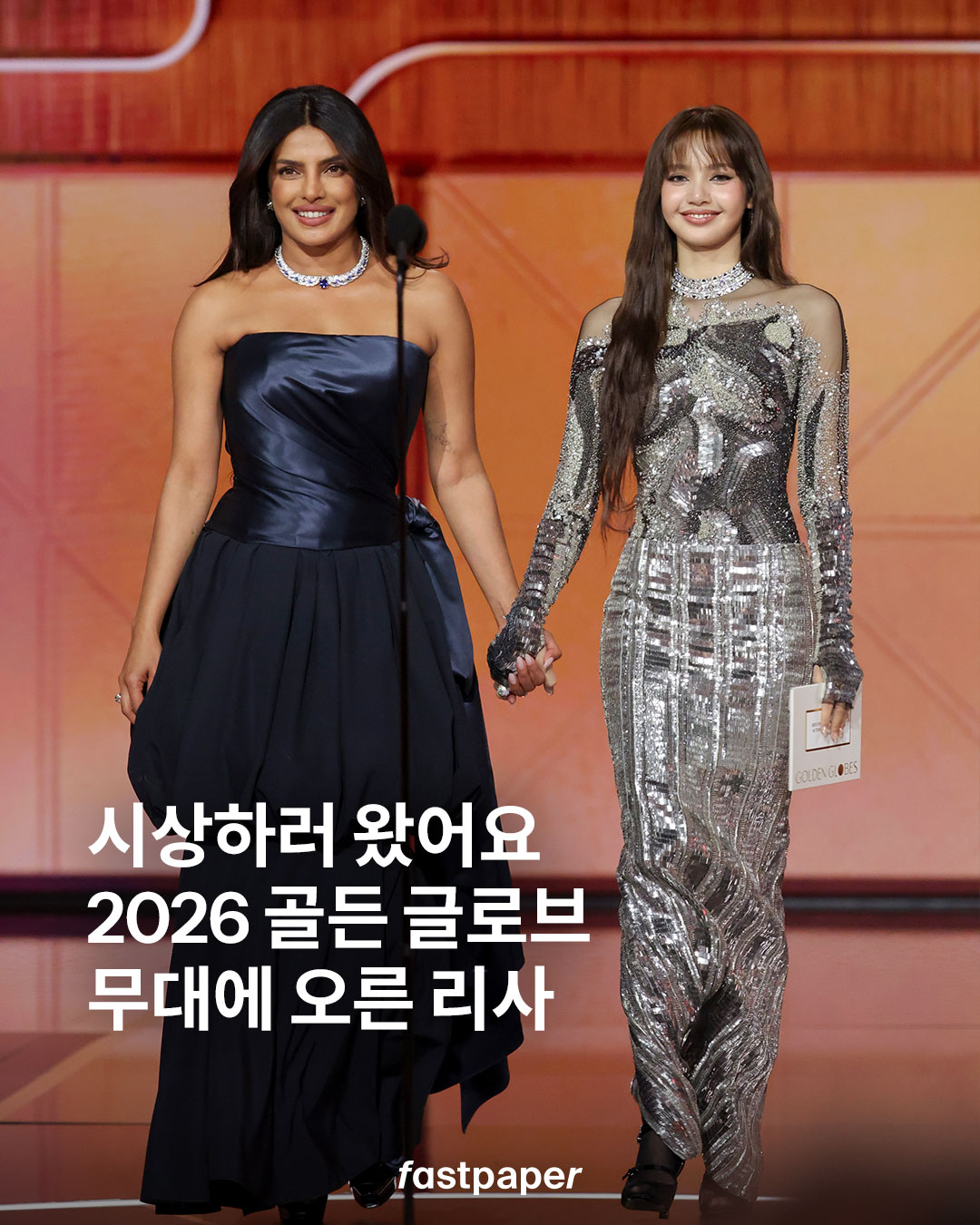 오늘은 시상하러 왔습니다. 2026 골든 글로브 시상식에 참석한 블랙핑크 리사가 시상자로 무대에 올랐어요. 레드 카펫에서는 선보인 검정 자크뮈스 드레스에 이어, 무대에서는 톰 브라운 2026 봄, 여름 착장을 입어 프리양카 초프라와 함께 남우주연상 부문을 시상했습니다.