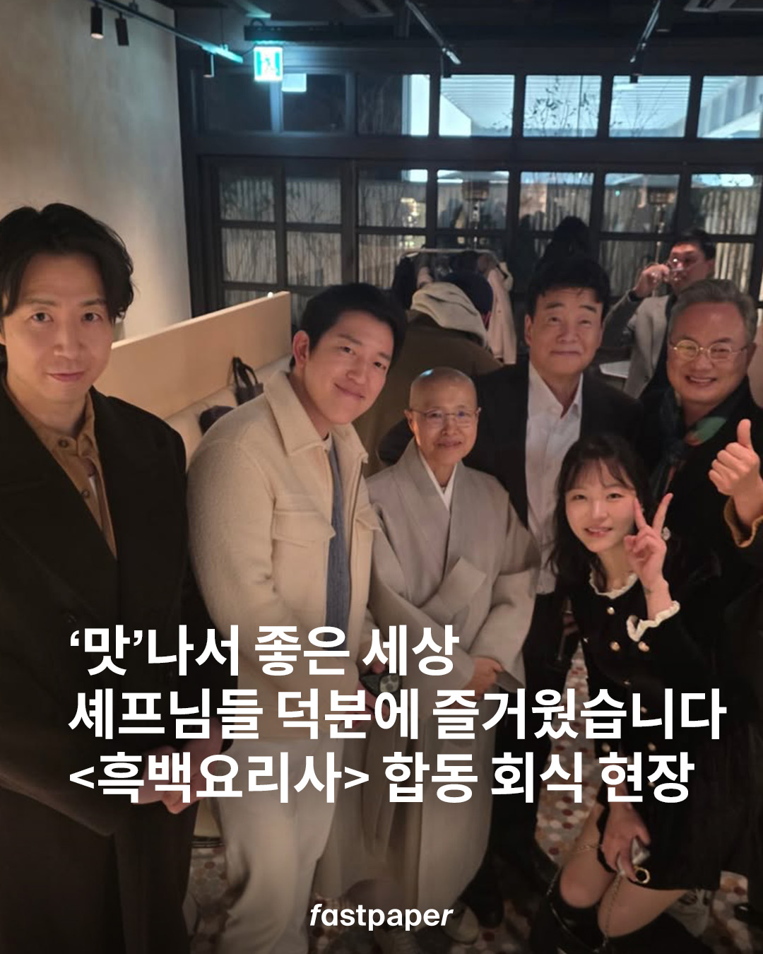 최종회가 공개된 날, <흑백요리사> 시즌 1, 2에 출연했던 셰프들의 뒷풀이 현장 사진을 안유성 명장이 공유했는데요. 프로그램 안에서는 늘 치열하고 날 선 승부를 보여줬던 분들이지만, 한자리에 모인 모습은 그저 오래 알고 지낸 사람들처럼 편안해 보입니다.