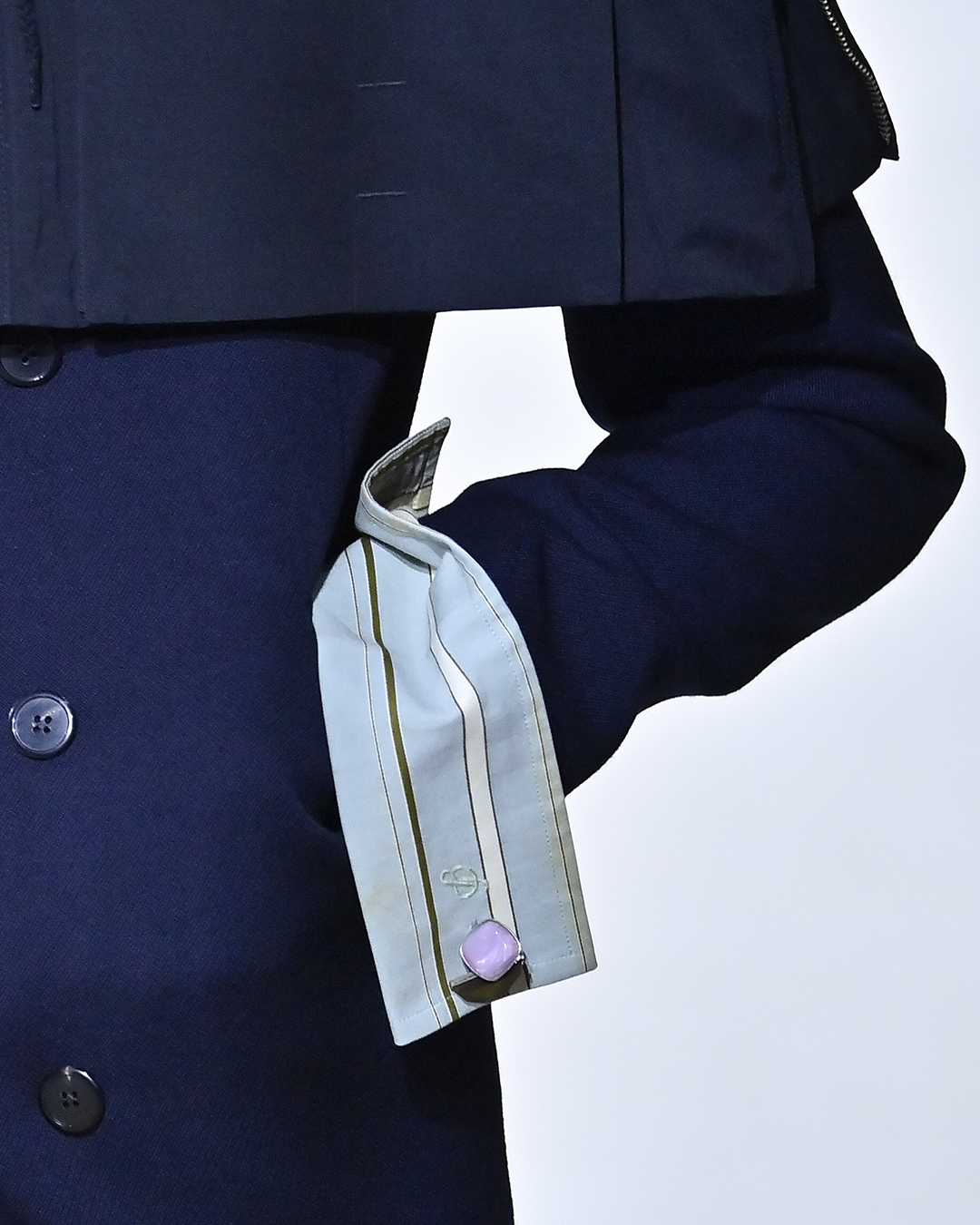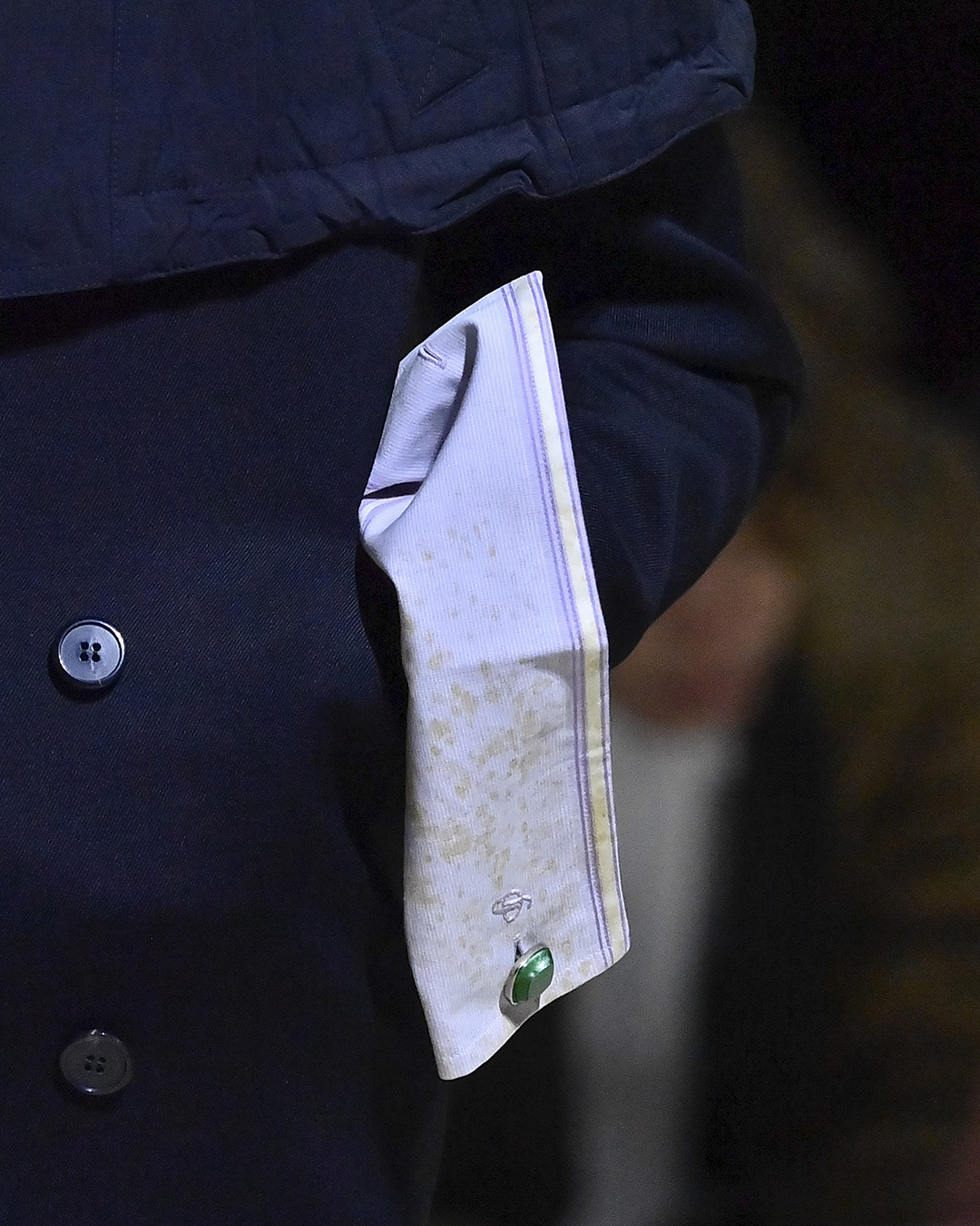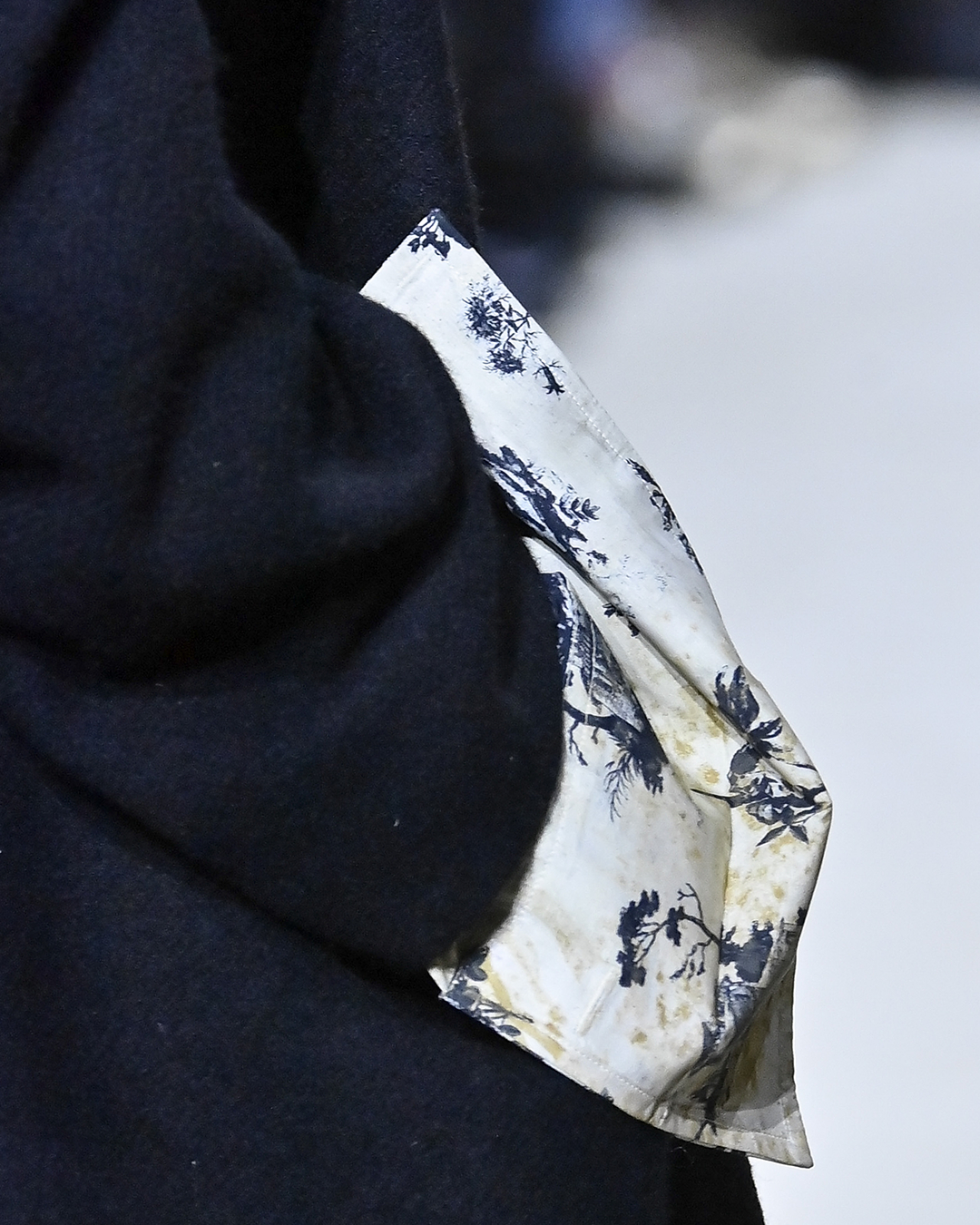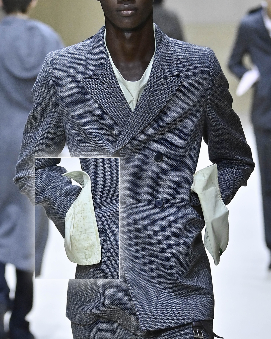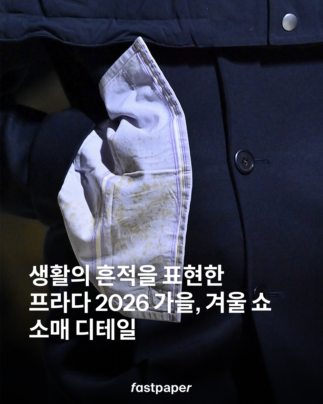 커피 자국이 묻고 때가 탄 듯한 프라다 쇼 속 셔츠 소매들. 폰다지오네 프라다의 데포지토에서 공개된 2026 가을, 겨울 남성복 컬렉션은 옷에 새겨진 삶의 흔적을 주목합니다.