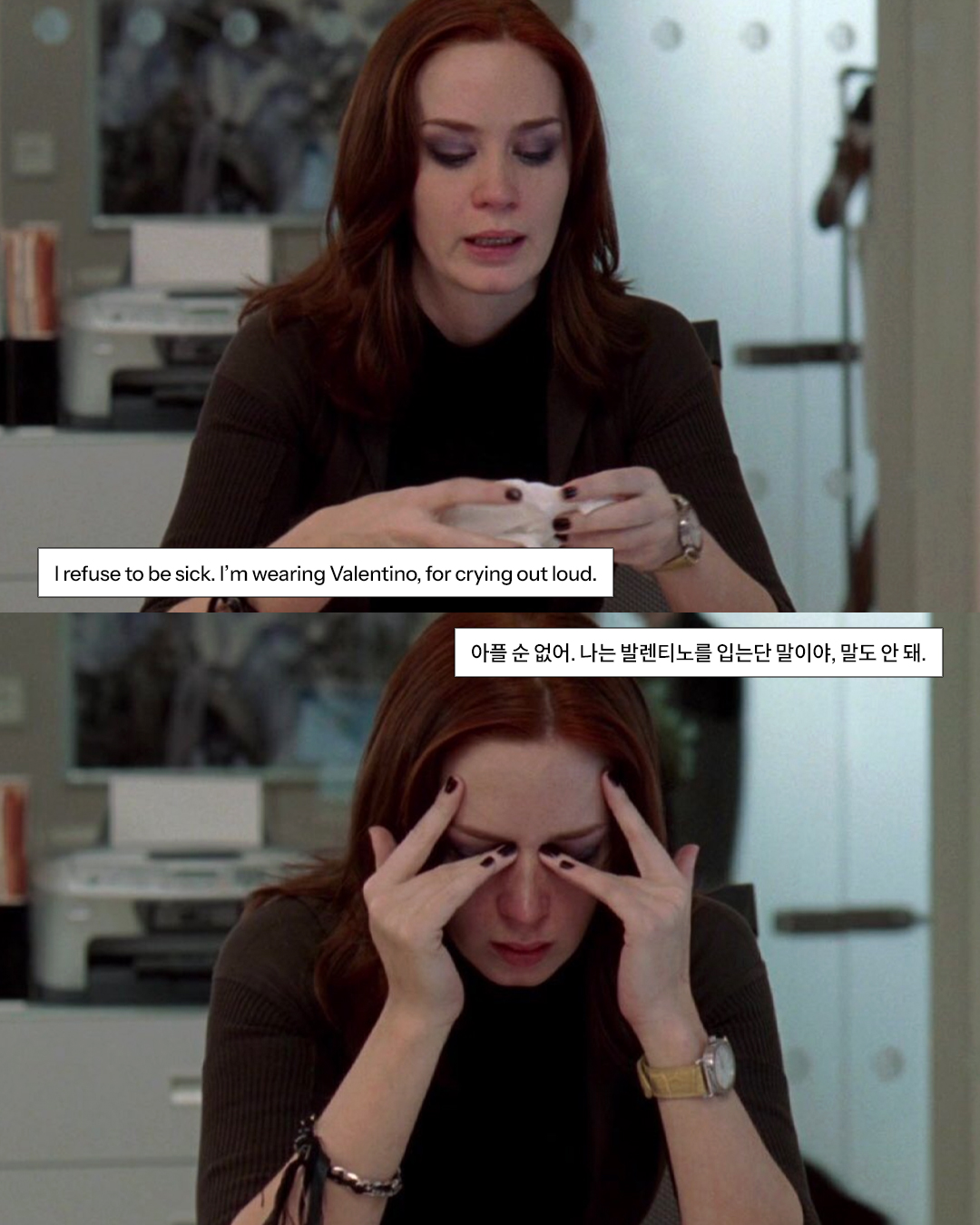 그 와중에 혼자 ‘OK’를 외친 사람이 발렌티노 가라바니였습니다. 어쩌면 안나 윈투어 이전부터 패션계를 장악했던 이름이었기에 가능한 선택이었을지도요.. 그래서 덕분에 발렌티노의 실명 카메오는 지금까지도 전설의 한 컷으로 남아 있습니다. 슬라이드를 넘겨, 영화 속 명대사 ‘I refuse to be sick. I’m wearing Valentino, for crying out loud.’도 다시 한번 곱씹어볼까요.
