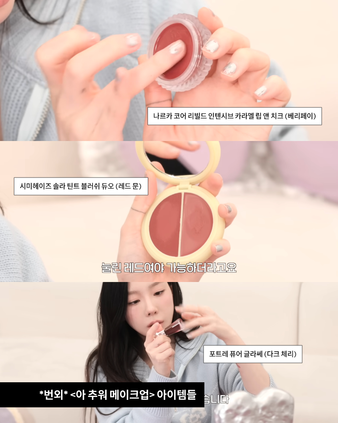 블러셔만 15종을 추천한 태연. 그녀가 단종을 막은 것으로 유명한 웨이크메이크의 블러셔 소프트뮤트 컬러도 빠질 수 없었죠. 어떻게 쓰나 싶을 정도의 붉은 색조들을 추천하며 일명 ‘아 추워 메이크업’ 아이템들도 선보였습니다. 이외에도 립, 하이라이터, 보습템 등 코덕 태연의 요즘 잘 쓰는 뷰티템들은 유튜브에서 확인 가능한데요, 영상 본 패페는 일단 장바구니에 다 담았습니다..