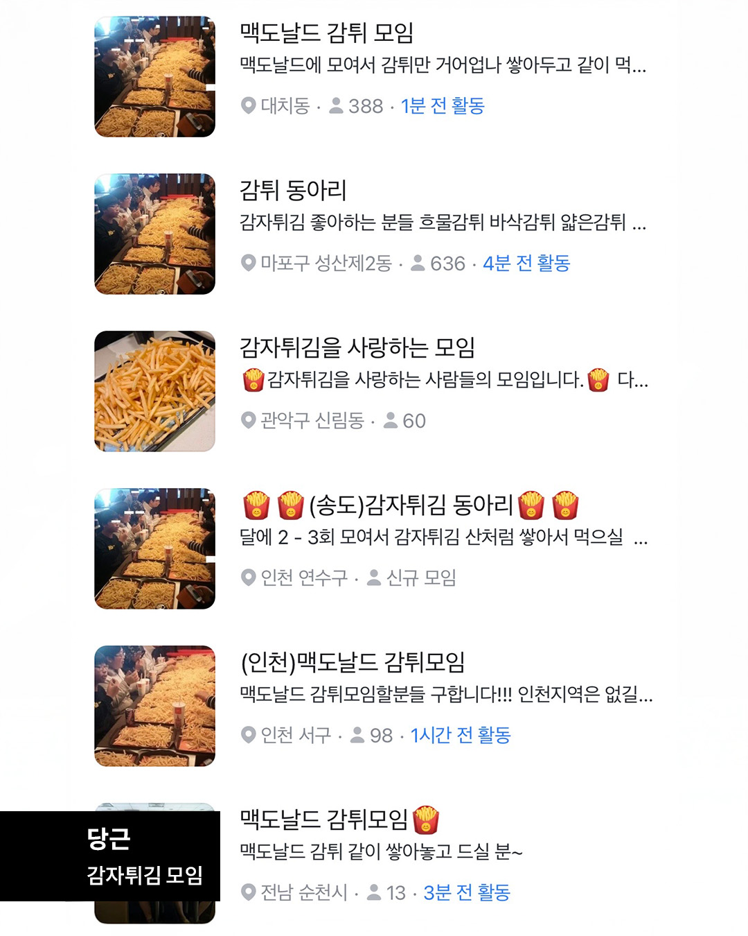 최근 지역 생활 커뮤니티를 중심으로 당근에서 감자튀김을 주제로 한 ‘감튀 모임’이 잇따라 등장하고 있습니다. 특정 목적이나 활동 없이, 오직 감자튀김을 좋아한다는 공통점 하나로 모이는 동네 단위 모임인데요.