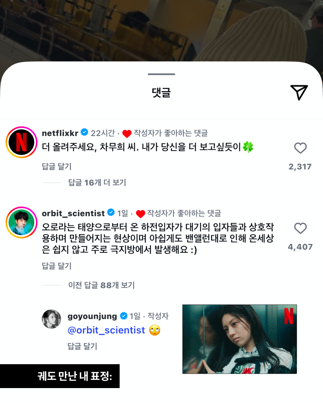 아직도 이사통 앓이 중인 사람? <이 사랑 통역 되나요?> 차무희 본체 고윤정이 ‘온 세상에 오로라가 뜨길’이라는 문구와 함께 비하인드 사진을 업로드했는데요. 과학 크리에이터 궤도가 단 댓글이 화제입니다.