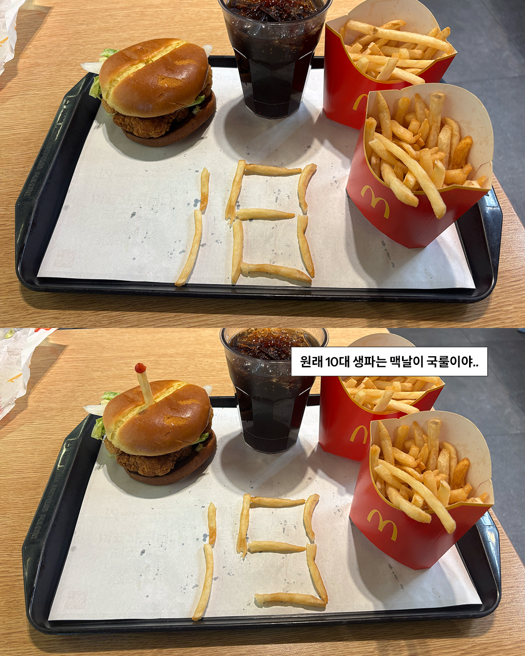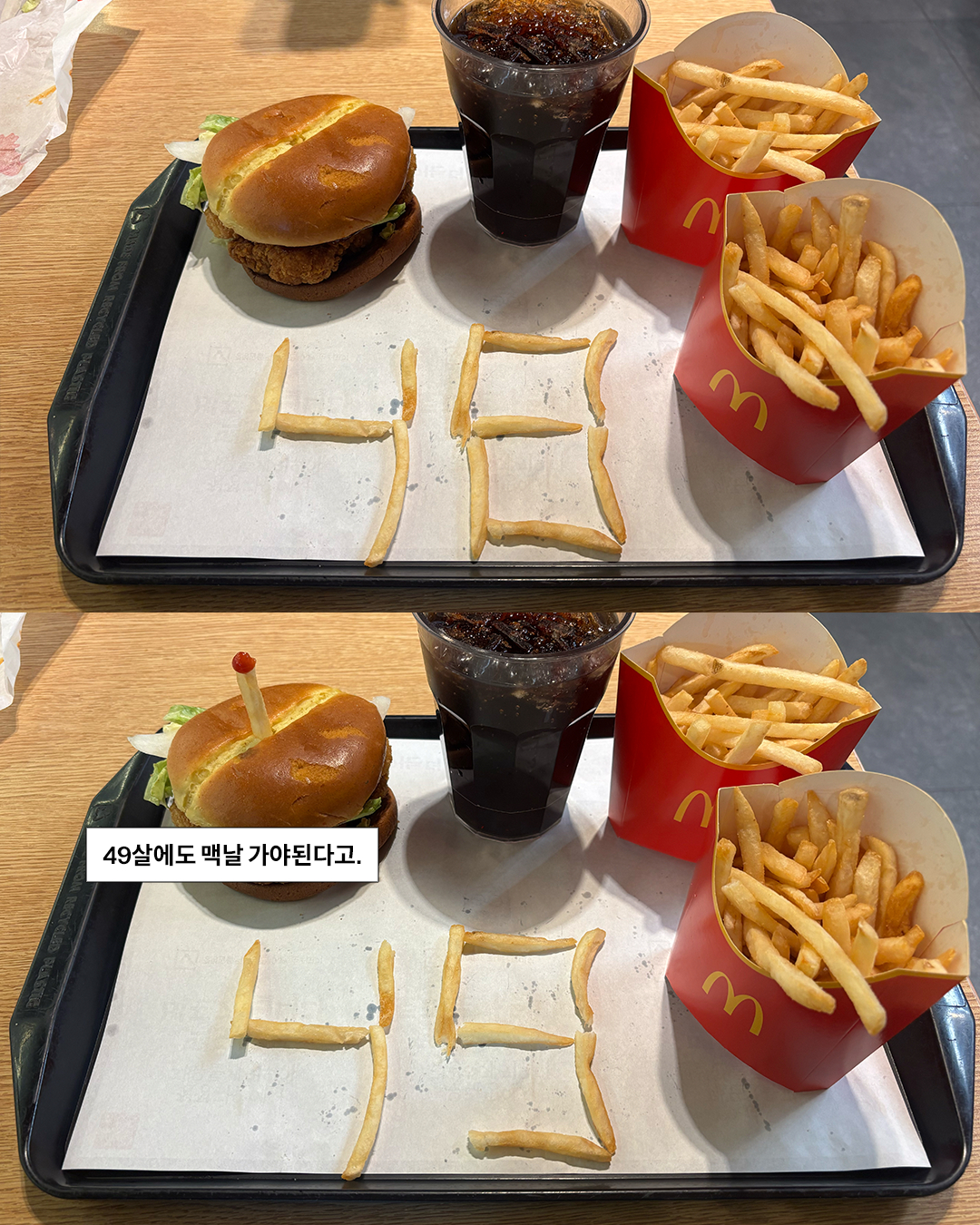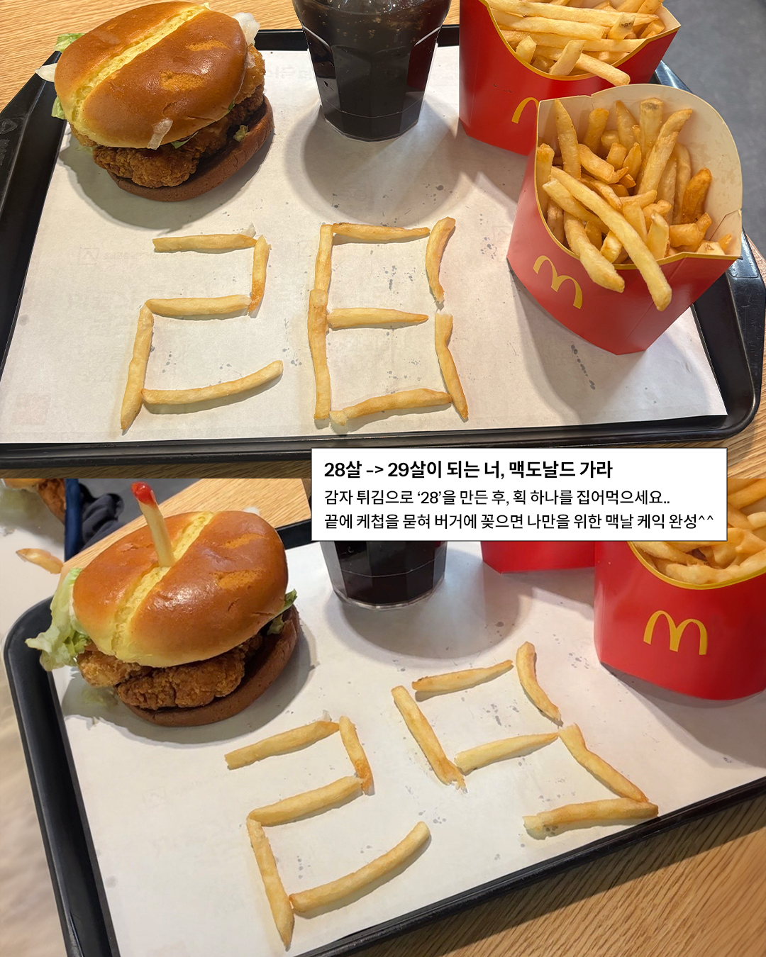 29살이 되는 경우, 먼저 감자 튀김으로 28을 만든 뒤 8의 한 획을 사라지게 만들어 29살로 만들면 끝입니다. 감자 튀김 한 획은 케첩을 묻혀 버거에 초처럼 꽂아주세요. 29살을 놓친 친구들아,, 걱정마요,,, 39살에도, 49살에도, 99살에도 맥도날드가 살아있다면 가면되니까~