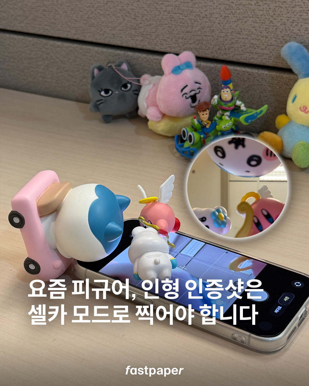 X를 통해 퍼져나가 많은 인증샷들이 나오고 있는 피규어 셀피. 촬영 방법은 간단합니다. 핸드폰을 셀카 모드로 설정 후 광각 모드로 설정합니다. 그리고 바닥에 내려놓은 뒤 액정 위에 피규어나 인형을 올려주면 끝!