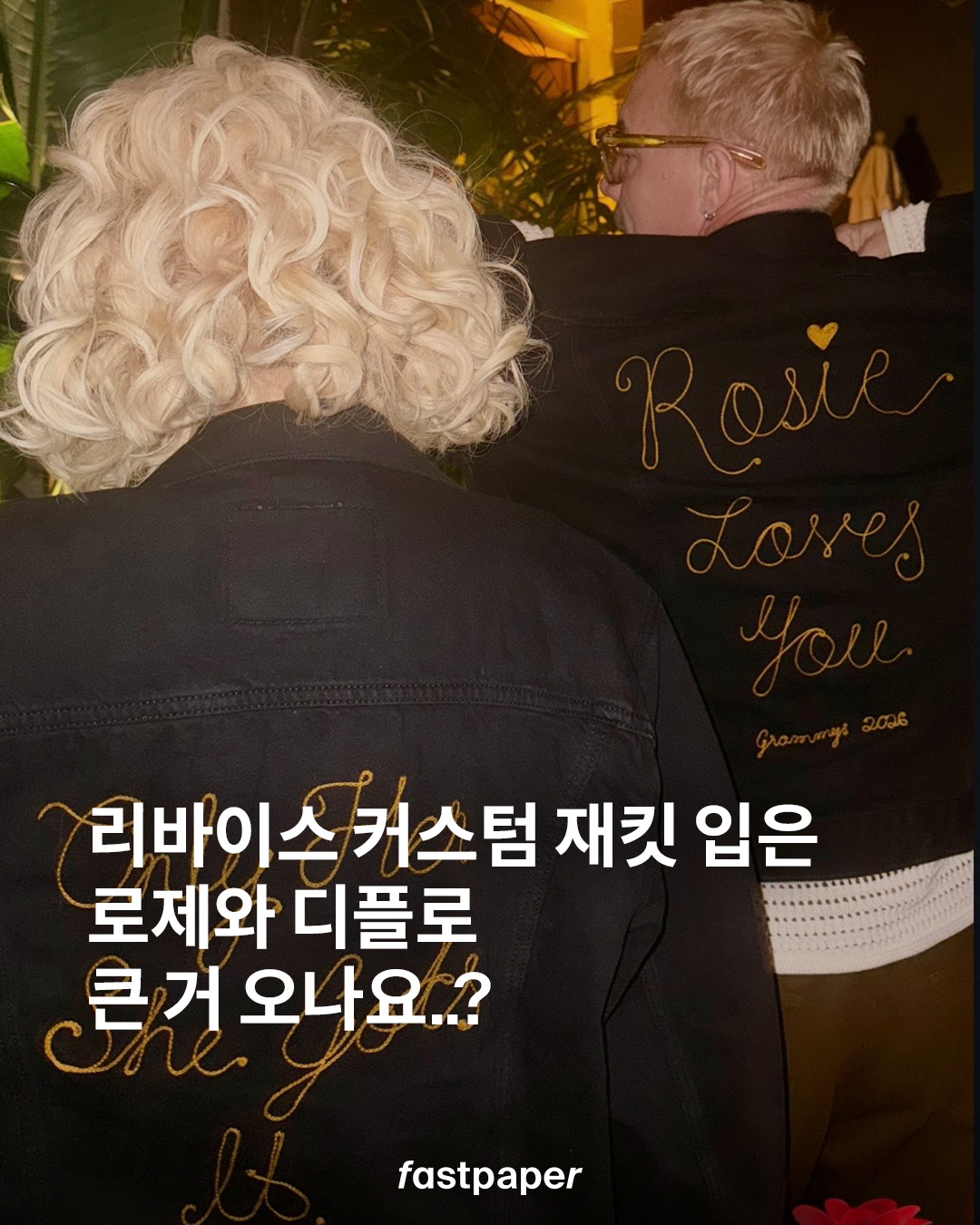 디플로가 입은 재킷에는 “Rosie loves you”와 “Grammys 2026”라는 문구가, 로제가 착용한 재킷에는 “Only Her. She Got It.”이라는 문구가 자수로 더해졌어요. 패페의 예상은 로제의 그래미 공연을 기념하는 리바이스 커스텀 재킷이 아닐까 싶은데요. 실제 협업으로 출시되어도 반응이 좋을 것 같네요!
