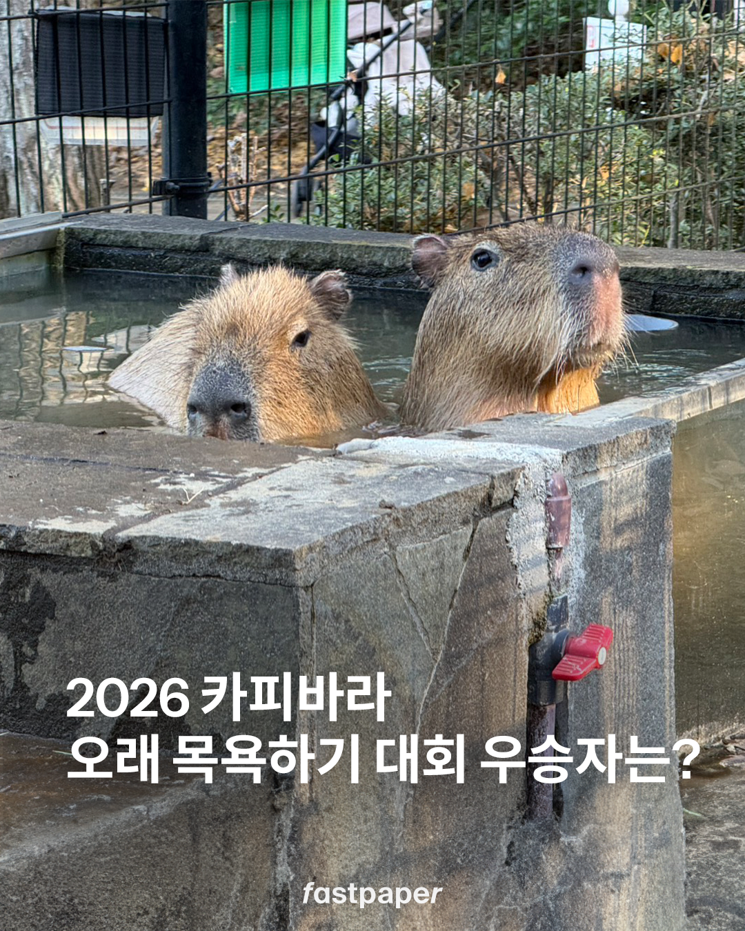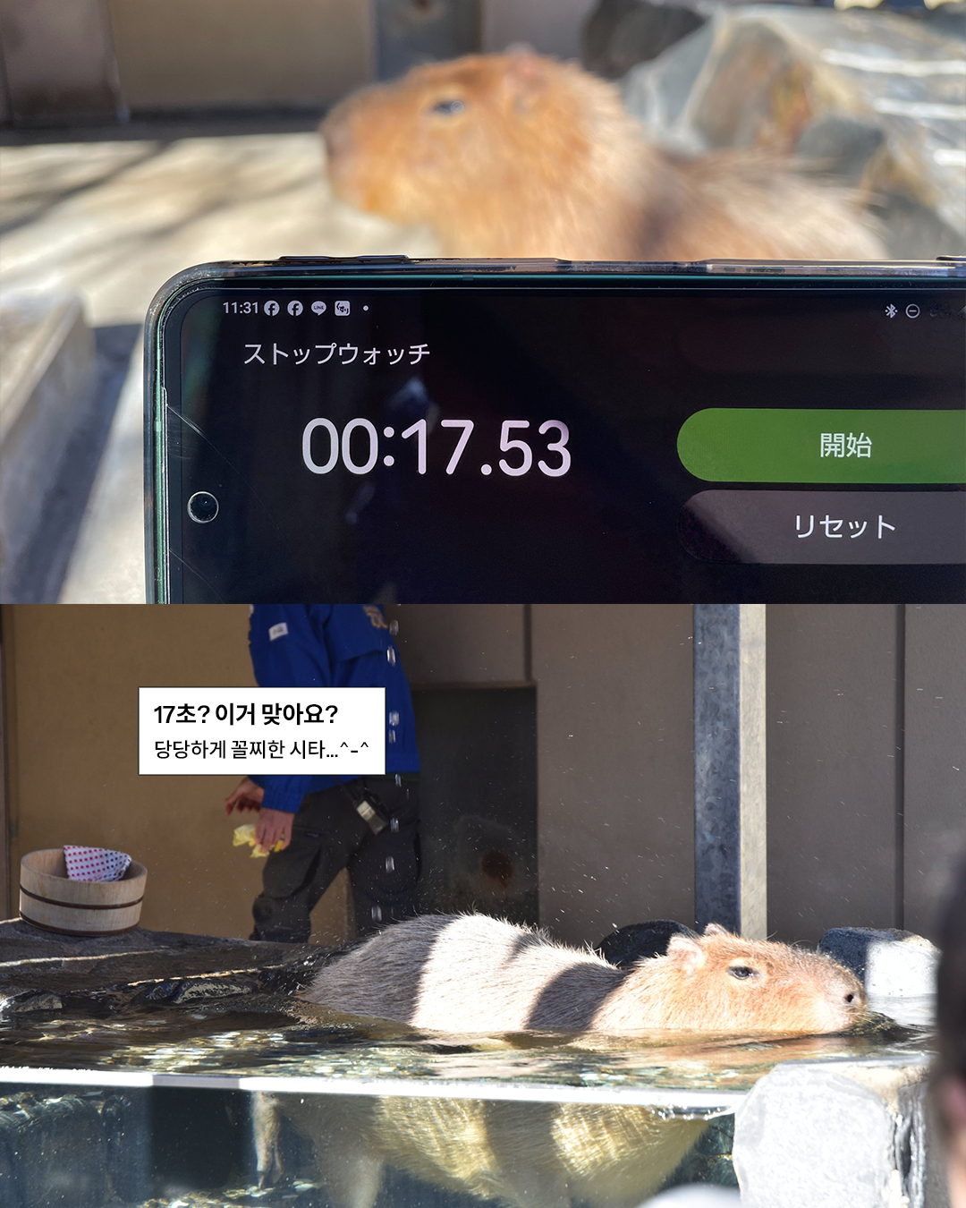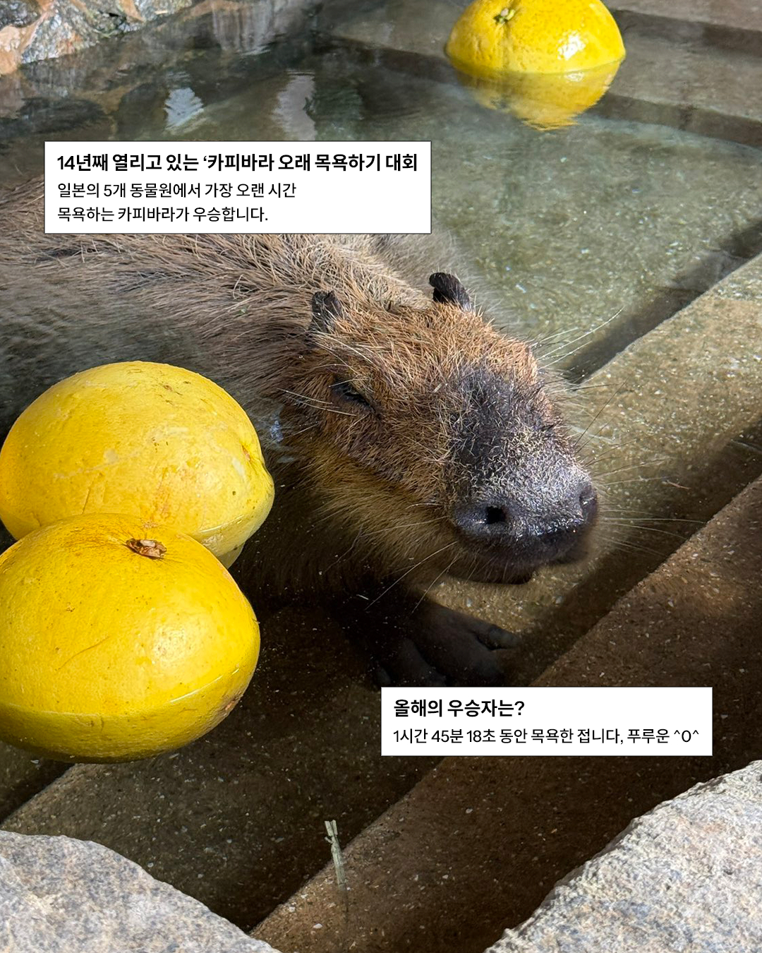 매년 일본의 5개 동물원에서 열리고 있는 ‘카피바라 오래 목욕하기 대회’! 무려 14년째 역사를 이어가고 있는 이 대회는 올해도 진행되었는데요. 사이타마현 어린이 동물자연공원, 이즈 샤보텐 동물공원 등에서 목욕 좀 오래 한다는 카피바라 다섯 마리가 참가했죠.