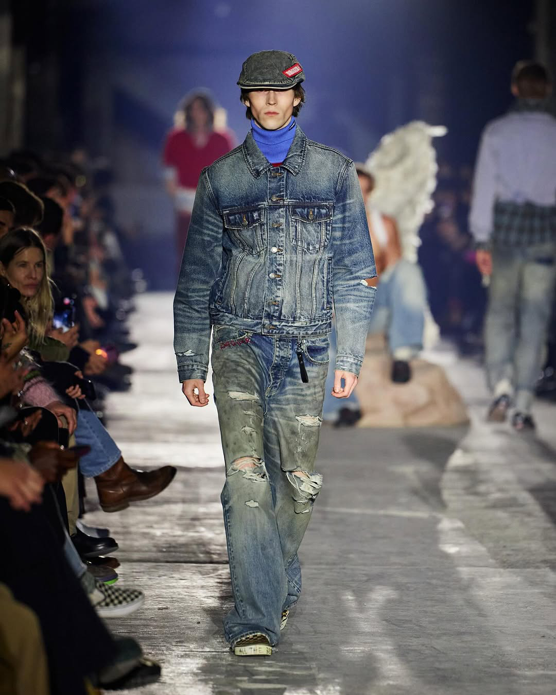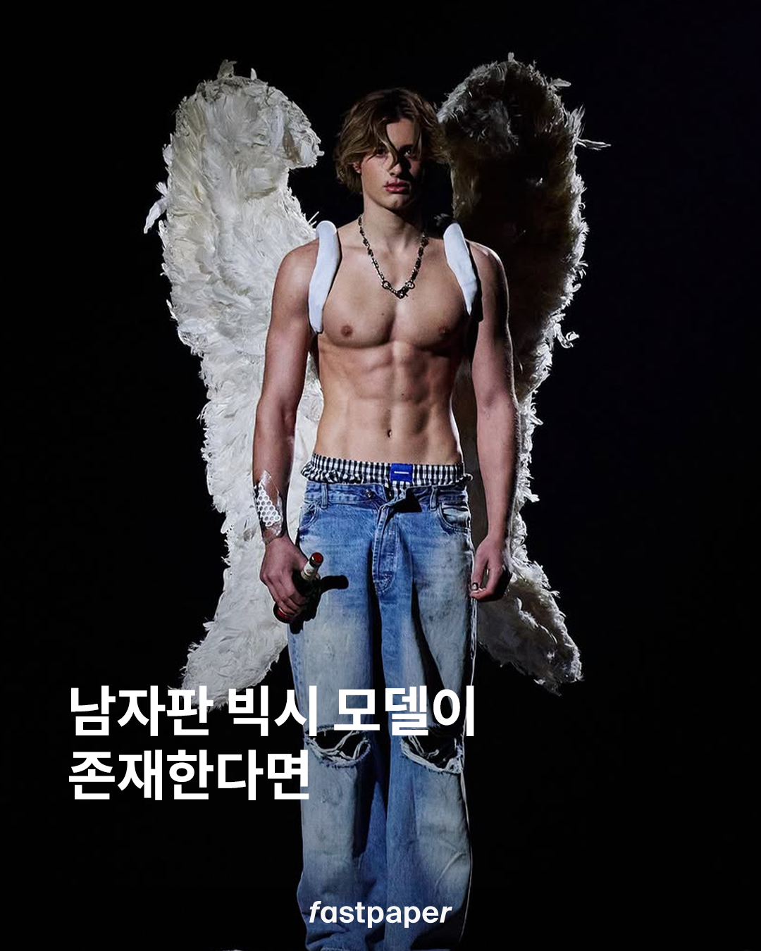 꼬질꼬질한 큰 날개를 달고, 팔에 반창고를 붙인 이 큐피드는 하늘에서 굴러 떨어진 타락천사의 느낌이 나기도 하는데요. 그는 런웨이 한복판에 자리잡고 앉아 모델들의 워킹을 바라보며 쿨키즈 버전의 큐피드가 되었습니다. 빅토리아 시크릿 엔젤에 남자 모델이 합류한다면 이런 맛일까요?