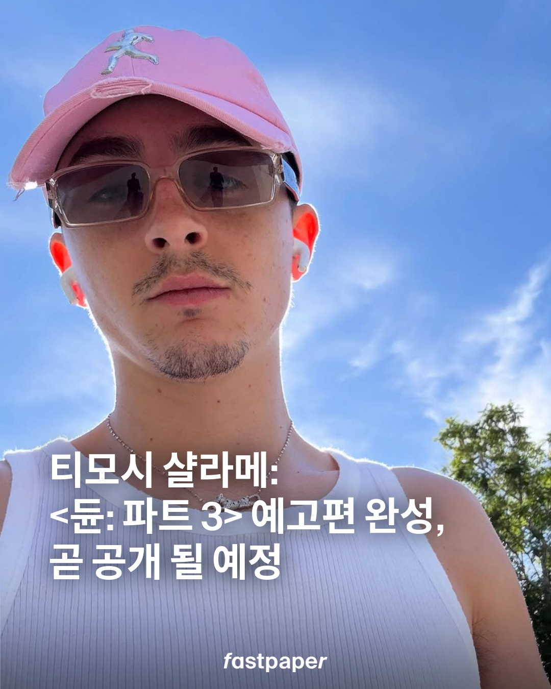티모시 샬라메가 프랑스 TV 쇼 ‘코티디앵’에서 <듄: 파트 3> 예고편에 관한 이야기를 전했습니다. 티모시는 예고편은 완성된 상태로, 곧 공개될 예정이라 밝혔는데요. 올해 12월 18일 개봉을 앞두고, 아직 어떠한 트레일러나 티저가 공개되지 않은 상황. 티모시 샬라메 말만 믿고 지켜보고 있을게요.