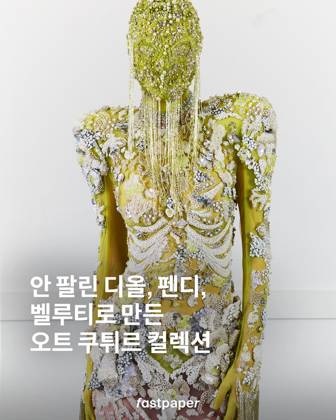 케빈 제르마니에의 2026 봄, 여름 오트 쿠튀르 컬렉션 ‘LES CHARDONNEUSES’. 이번 컬렉션의 특징은 가장 아이코닉한 하이엔드 브랜드들의 팔리지 않은 옷들을 재활용해 제작했다는 것입니다. 루이 비통, 디올, 펜디, 겐조 등을 소유하고 있는 LVMH 그룹의 룩들을 모아, 케빈 제르마니에의 섬세함과 화려함을 가미했죠. 특히 벨루티가 제작한 2024년 파리 올림픽의 프랑스 팀 유니폼을 사용하기도 했어요.