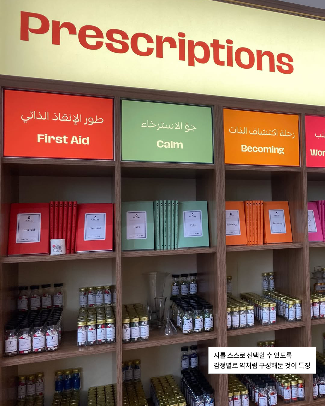 이곳은 책을 사는 공간이라기보다, 문학으로 마음을 돌보는 공간에 가까운데요. 서점 내부는 일반적인 진열 대신 감정 처방 카테고리와 시 처방 공간으로 구성되어 있고, 시집부터 논픽션까지 ‘위로’, ‘영감’, ‘기쁨’ 같은 감정 테마로 큐레이션 되어 있습니다. 게다가 실제 약병처럼 보이는 ‘시 알약’도 판매 중. 병안에는 지금의 마음 상태에 딱 맞는 시 구절이 롤 형태로 담겨 있다고 해요.