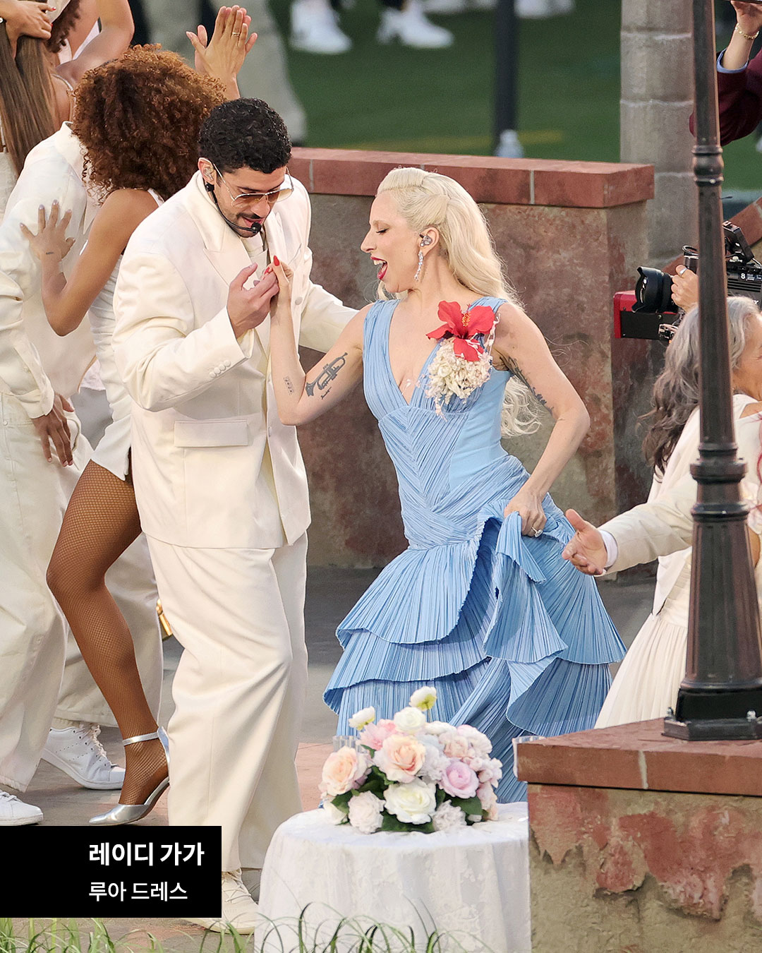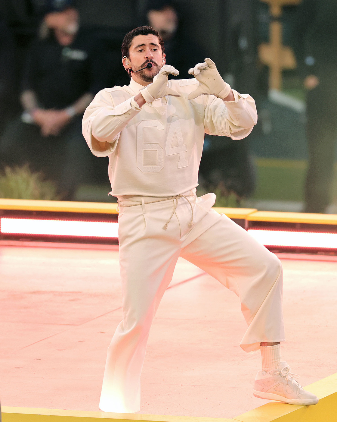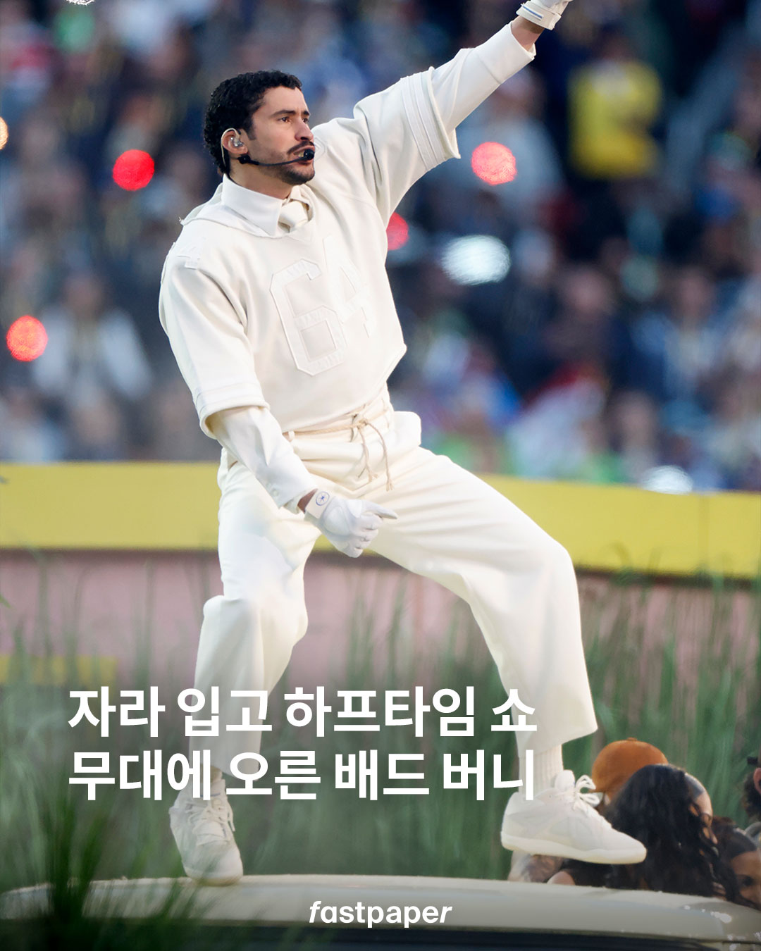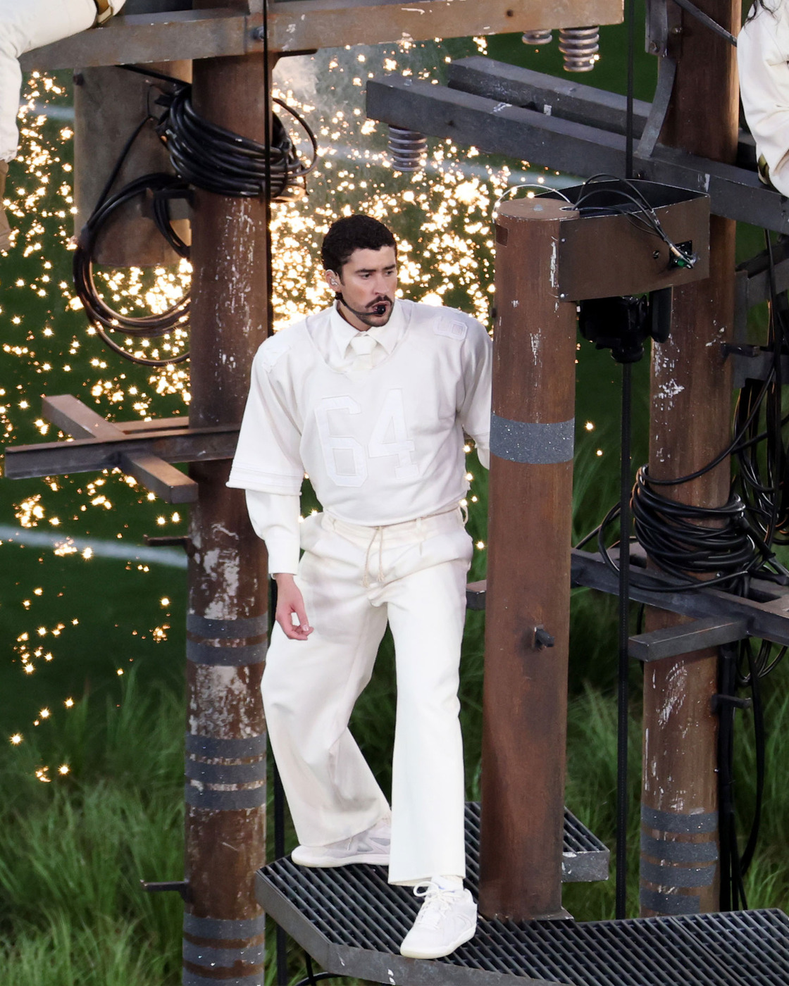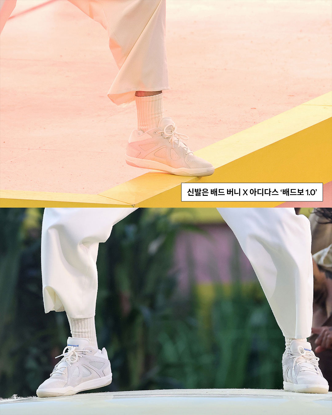 배드 버니는 이번 공연에 머리부터 발끝까지 올화이트 룩으로 등장했는데요. 그가 택한 의상은 자라, 슈즈는 새롭게 공개된 배드 버니와 아디다스의 협업 ‘배드보 1.0’으로 완성되었습니다.