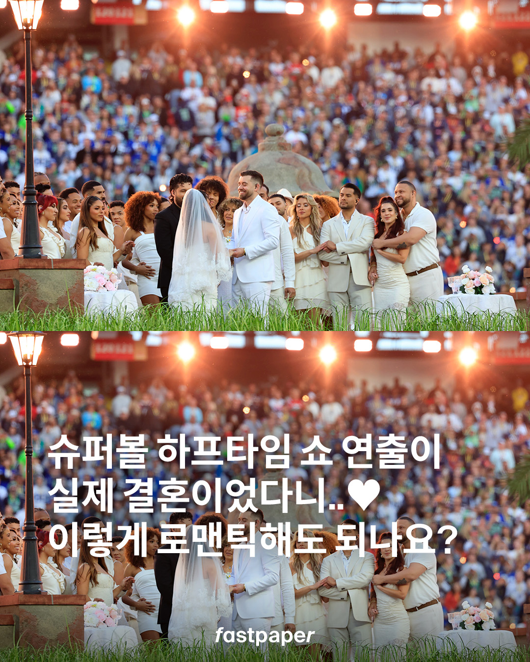 공연 중 배드 버니가 반지를 건네는 장면을 시작으로 프러포즈, 케이크와 축하 퍼포먼스까지 이어지며 무대는 하나의 거대한 웨딩 파티로 확장됐고, 이 모든 순간은 연출이 아닌 실제 결혼식으로 진행됐다니.. 로맨틱한 하프타임 쇼는 처음이에요.