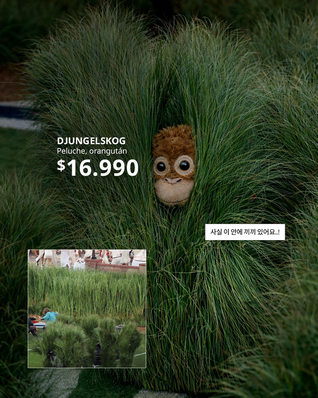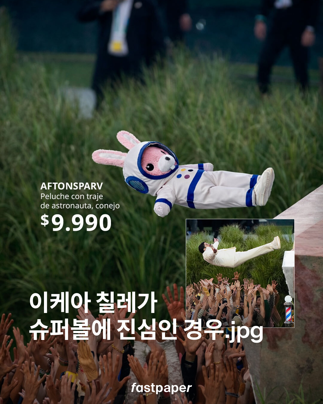 배드버니의 낙하 퍼포먼스를 패러디 중인 아프톤스파르브 우주비행사 토끼. 진짜 사람이 숨어 있던 덤불 장면은 사실 오숭이가 숨어 있었습니다. 2027 슈퍼볼에도 이케아 칠레의 패러디가 등장하려나요? 내년에는 공식 협업으로 함께 등장하면 귀여울 것 같네요.