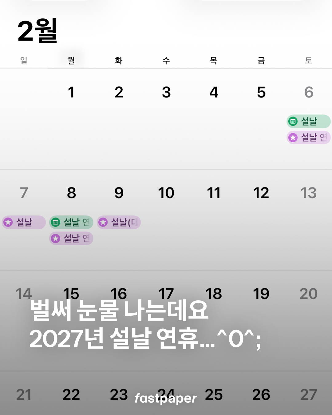 벌써 올해 설연휴도 반이 지나가버렸습니다. 내년 설 연휴, 미리 미리 알아둬야겠죠? 2027년 달력을 열었는데, 설 연휴가 있었는데 없어졌습니다. 2월 6일 토요일부터 시작되는 설 연휴는 2월 8일까지가 끝. 2월 9일 대체 휴일이 있지만, 평일에 쉬는 날은 단 이틀 뿐이네요…^^ 벌써 절망적이네요…