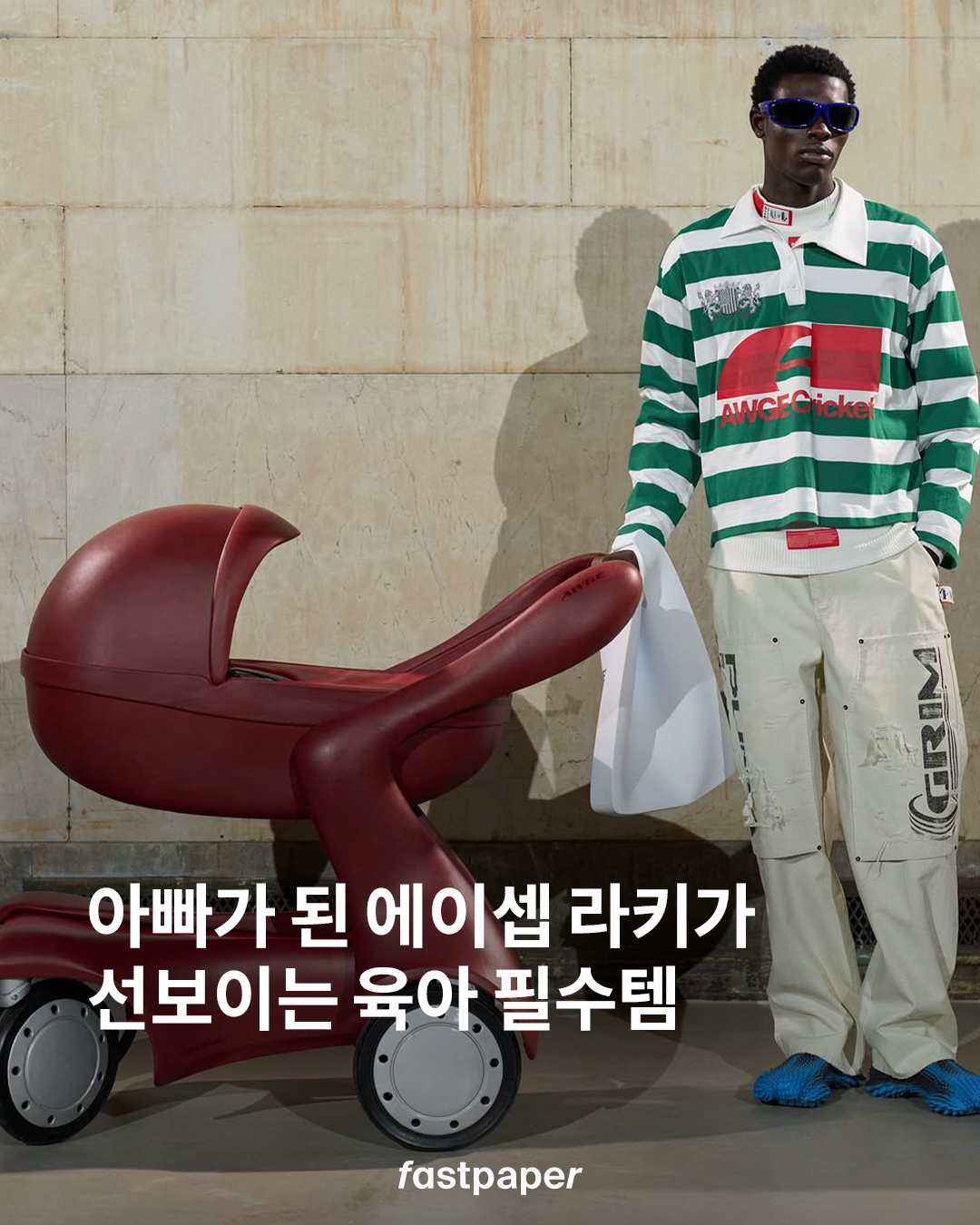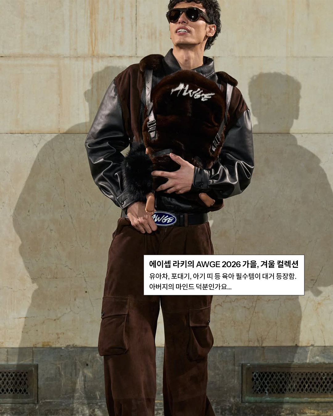 에이셉 라키의 패션 브랜드 AWGE! AWGE의 2026 가을, 겨울 컬렉션이 공개된 가운데, 에이셉 라키의 부성애가 돋보이는 아이템들이 화제입니다. 그는 유아차와 아기 스트랩 등을 선보이며 스트리트 웨어에 ‘DADHOOD’ 요소를 가미했죠. 이게 바로 아버지의 마음일까요? 레더 재킷을 두르고 퍼 소재의 아기 스트랩을 착용한 룩은 패션도 육아도 놓칠 수 없는 부모님들에게 추천하고 싶네요.