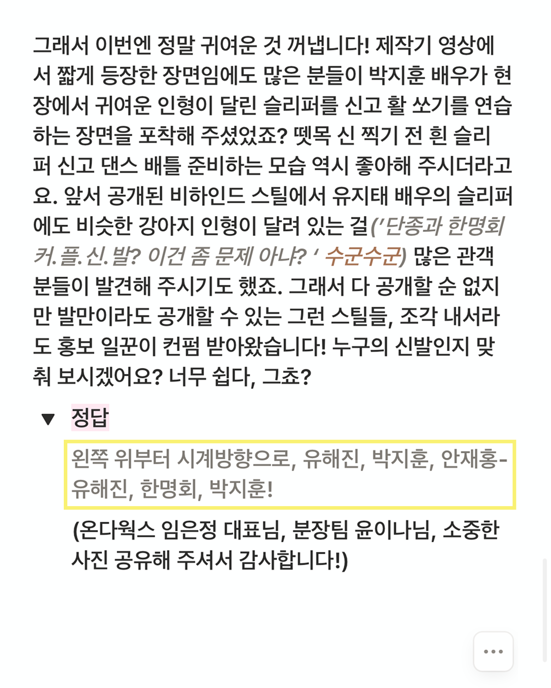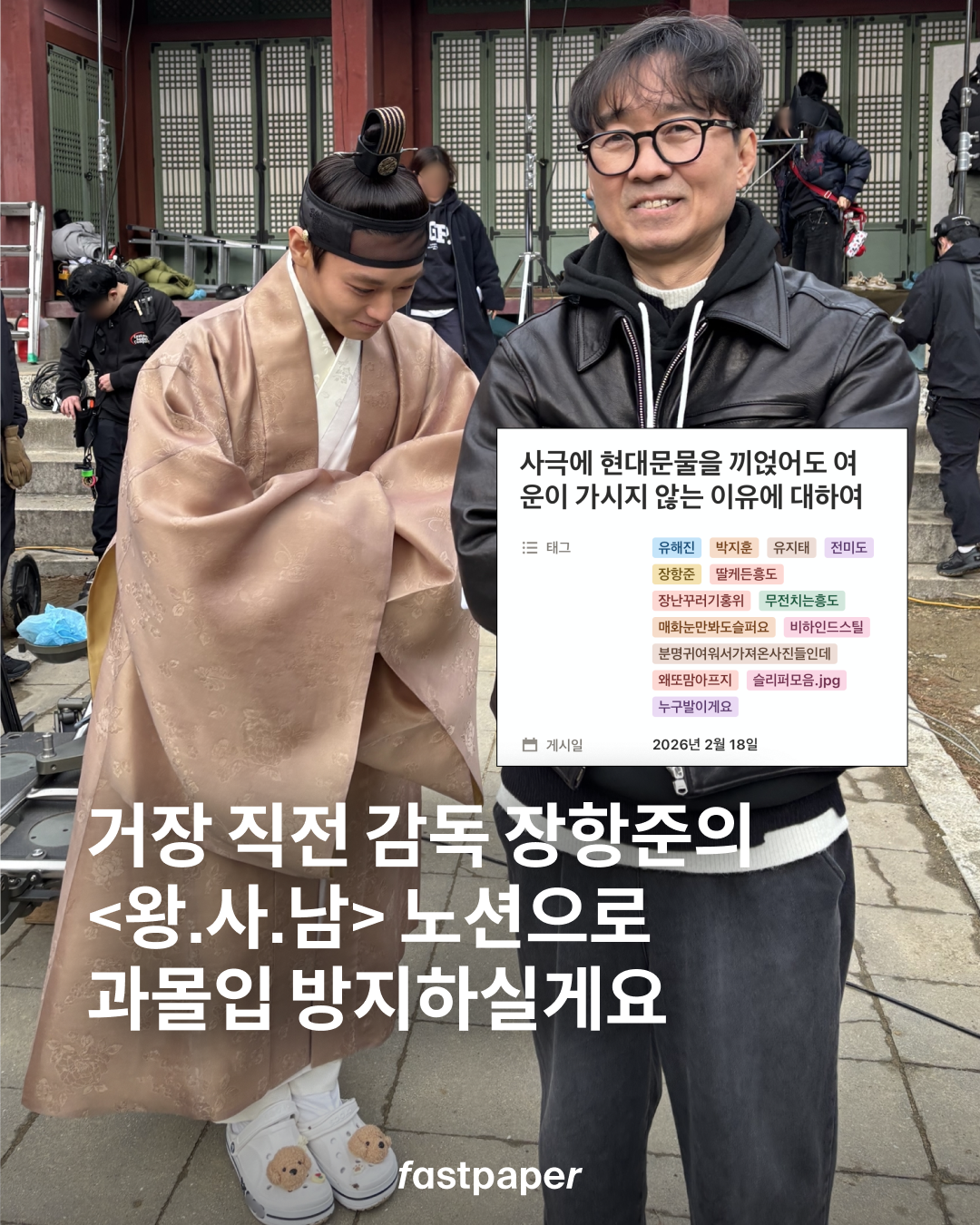 배급사 쇼박스가 제공하는 ‘촬영실록’! 일명 쇼박스의 홍보 일꾼이 운영 중인 노션에는 촬영 비하인드와 에피소드가 가득하죠. 곧 500만 관객 달성이 예상되는 <왕과 사는 남자>에 빠지셨다면, 과몰입 방지하고 가시길..