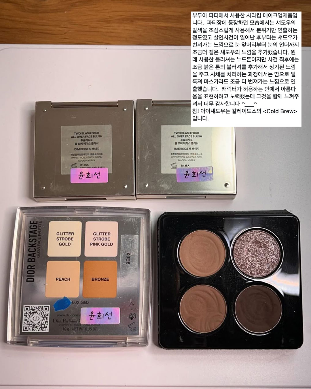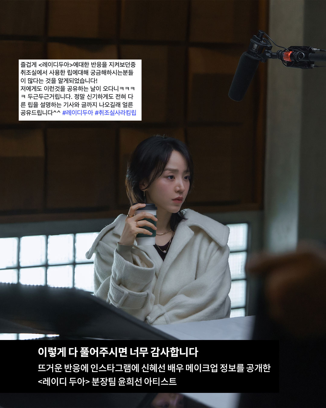 사라 킴을 맡은 신혜선의 베이스부터 립까지, 디테일한 제품 정보를 직접 공개한 <레이디 두아> 분장팀 윤희선 아티스트. 취조실에서 사라 킴이 바른 립 컬러부터 ‘부두아’ 파티 씬의 블러셔와 립 제품까지, 궁금했던 정보들을 하나하나 풀어줬습니다.