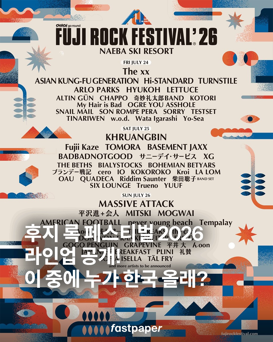 후지 록 페스티벌의 라인업이 공개되었습니다. The XX, Khruangbin, Massive Attack 세 팀이 헤드라이너를 장식했네요.