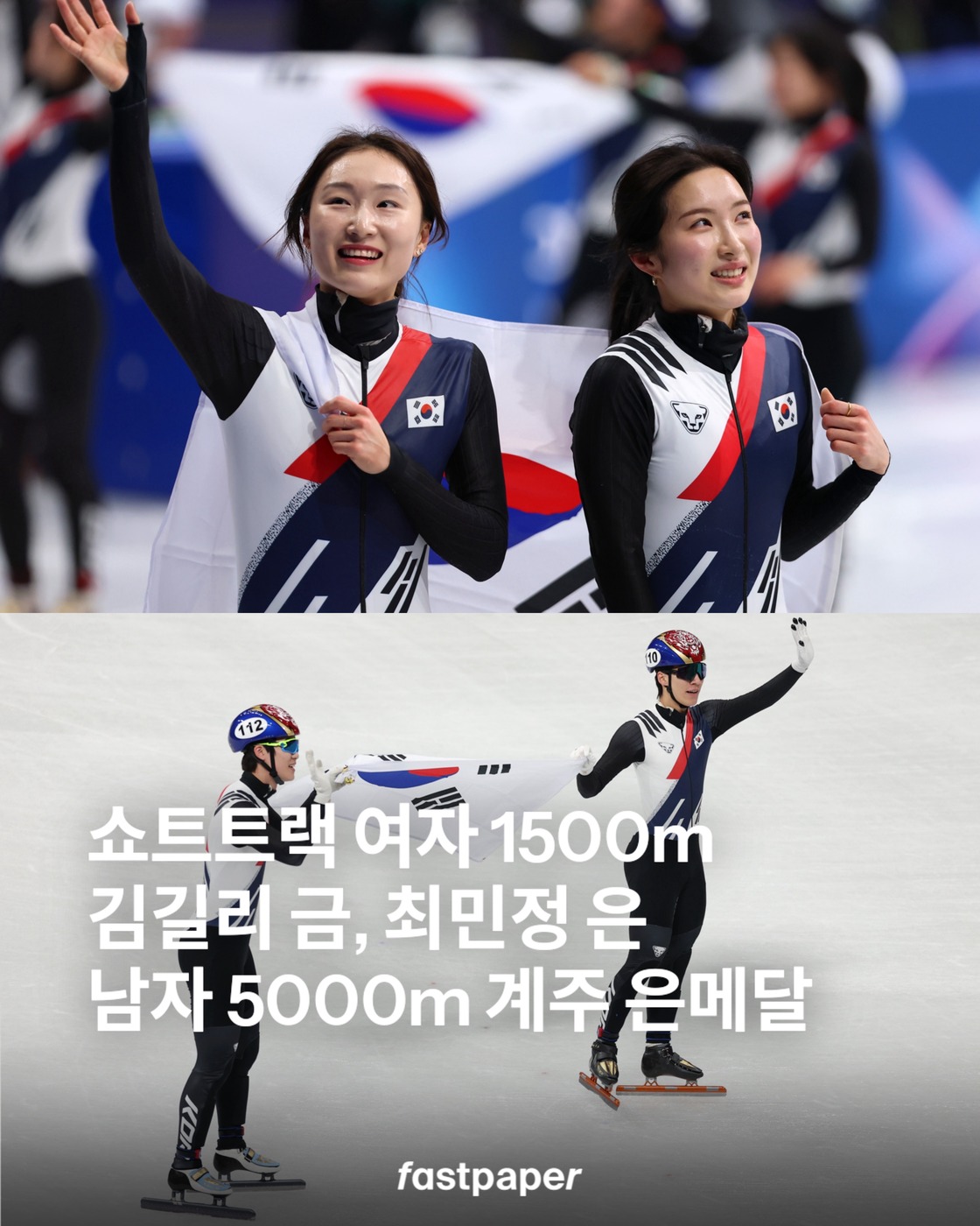 김길리는 여자 1500m 결승에서 가장 먼저 결승선을 통과, 곧바로 최민정이 들어오며 1, 2위를 기록했습니다. 김길리의 금메달로 한국 선수단은 이번 대회 세 번째 금메달을, 최민정 선수는 개인 통산 7개의 메달을 수확해 동·하계 통틀어 한국 역대 최다 올림픽 메달리스트가 되었습니다.