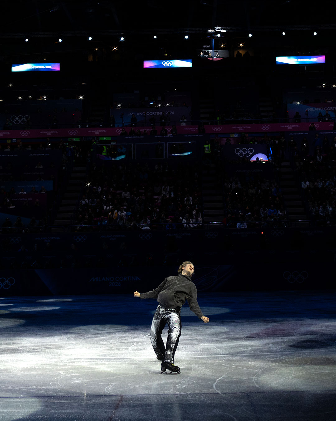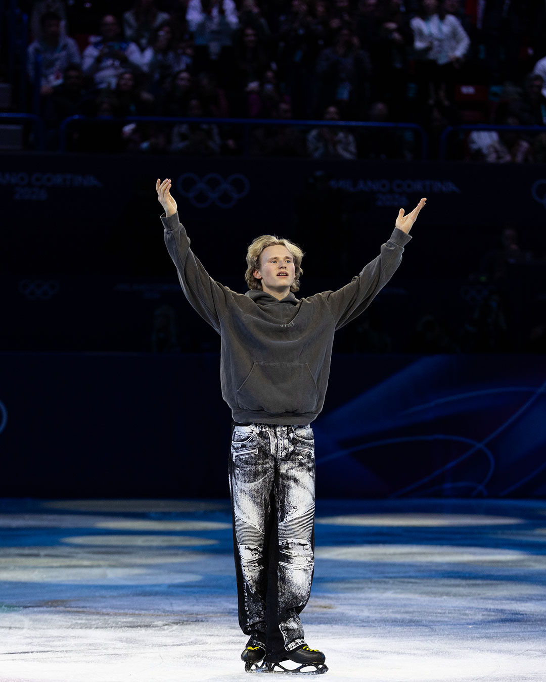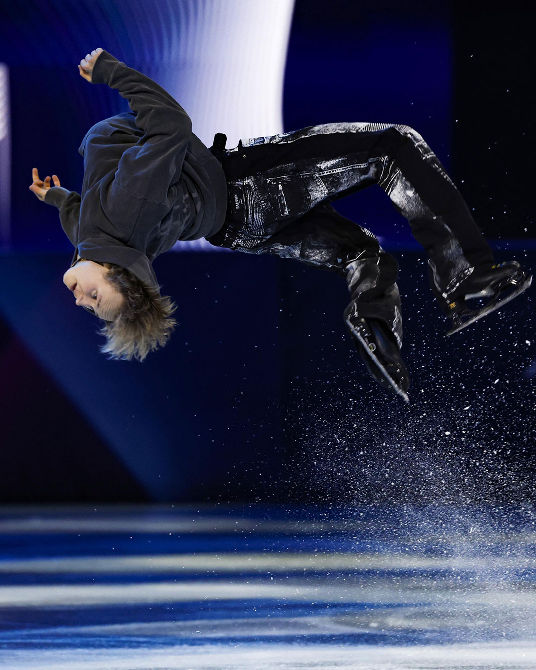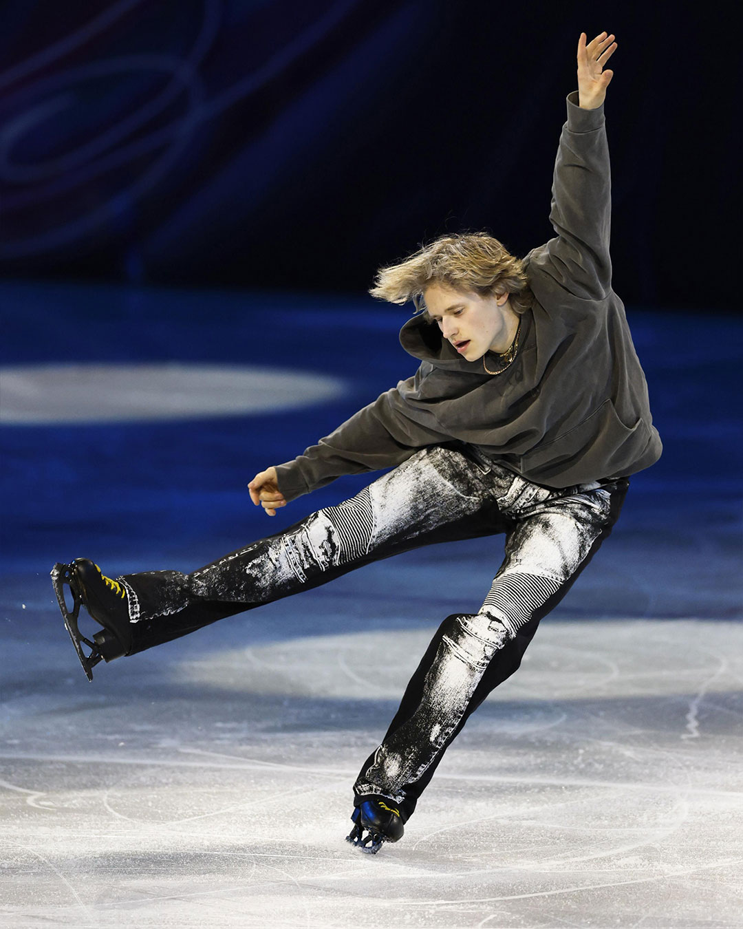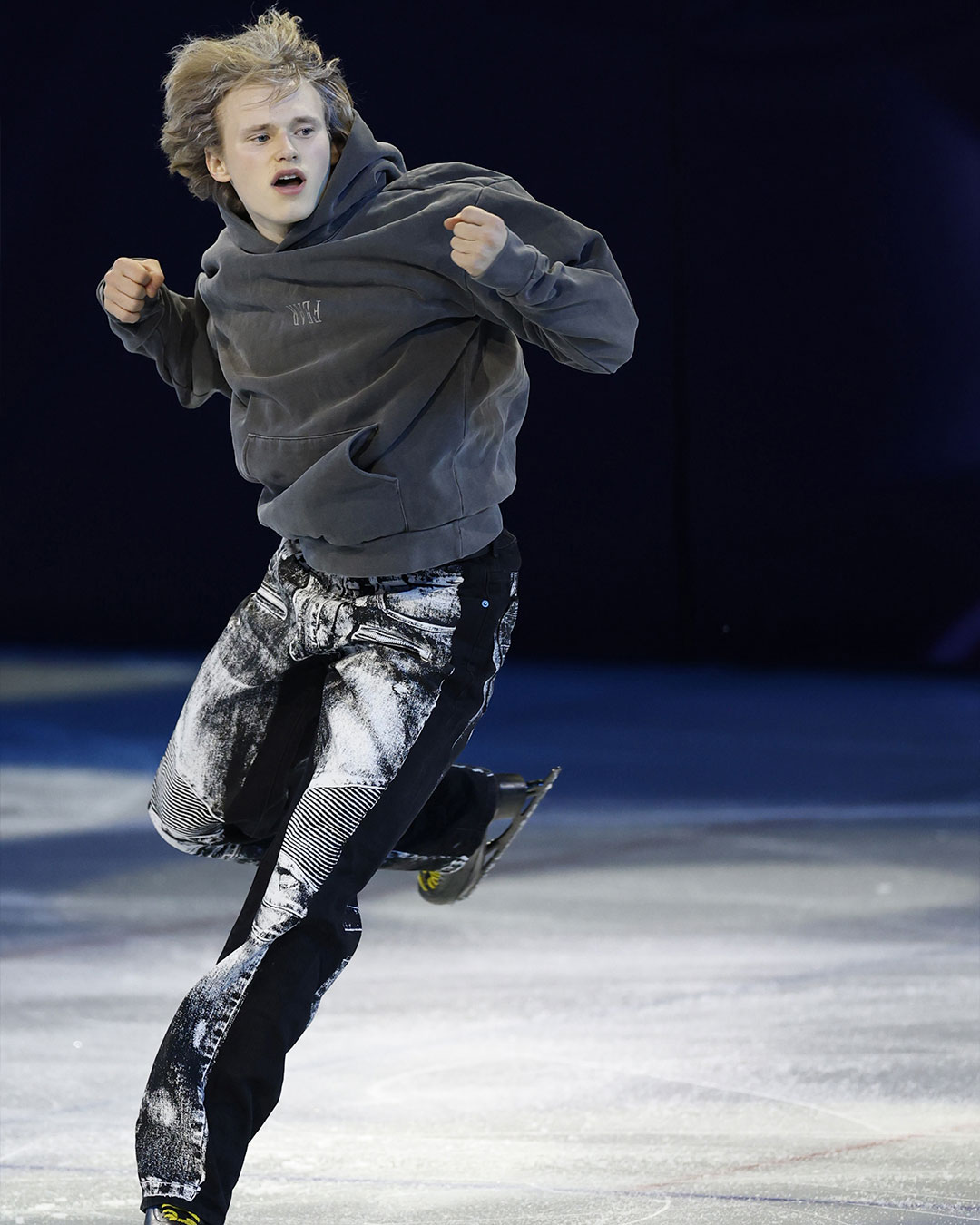 아이스 위에 오른 말리닌이 선택한 룩은 회색 후드티와 트롱프뢰유 데님 팬츠. 그가 착용한 바지는 발망 제품으로, 현재 웹사이트 및 매장에서 구매할 수 있어요.