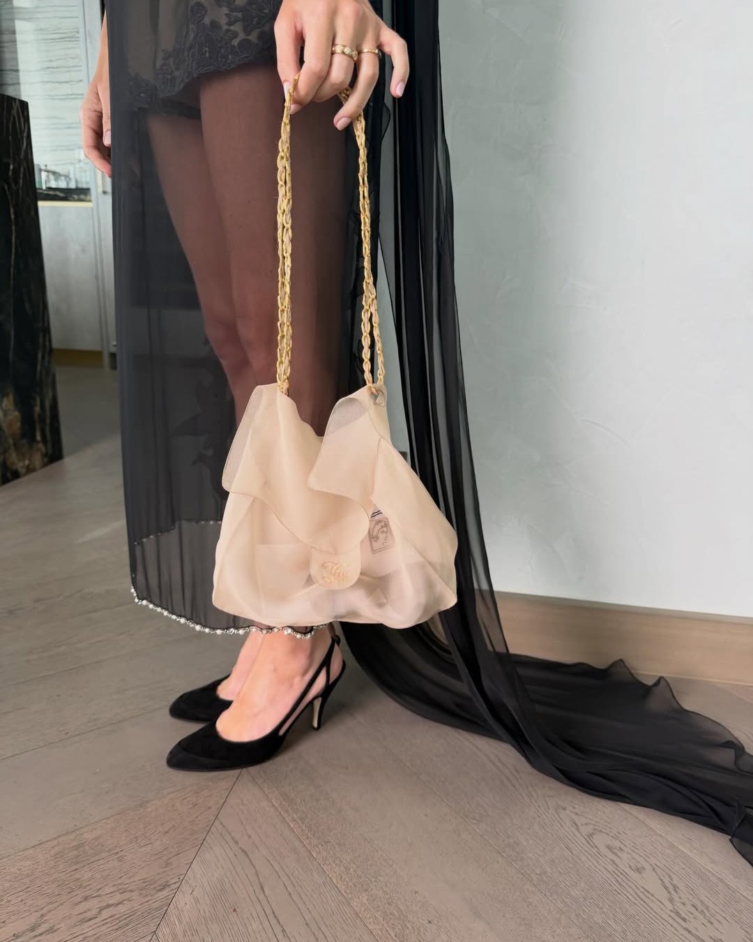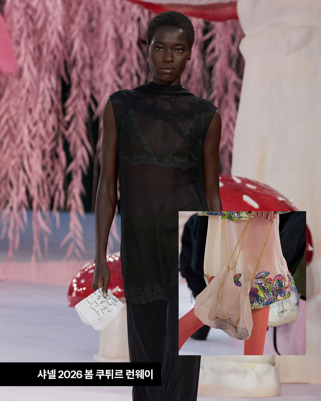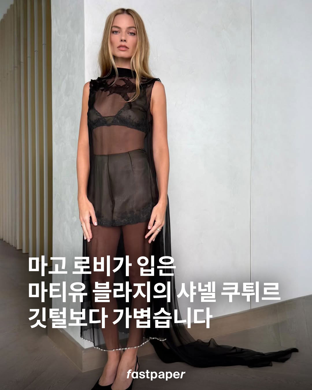 이번 시즌 블라지의 쿠튀르는 깃털보다 가벼운 오간자 소재로 완성한 트롱프뢰유 룩들로 가득했는데요. 마고 로비가 입은 피스 역시 길게 흐르는 트레인이 특징인 드레스에, 오간자로 만든 샤넬 핸드백과 선글라스로 완성된 스타일이었습니다.