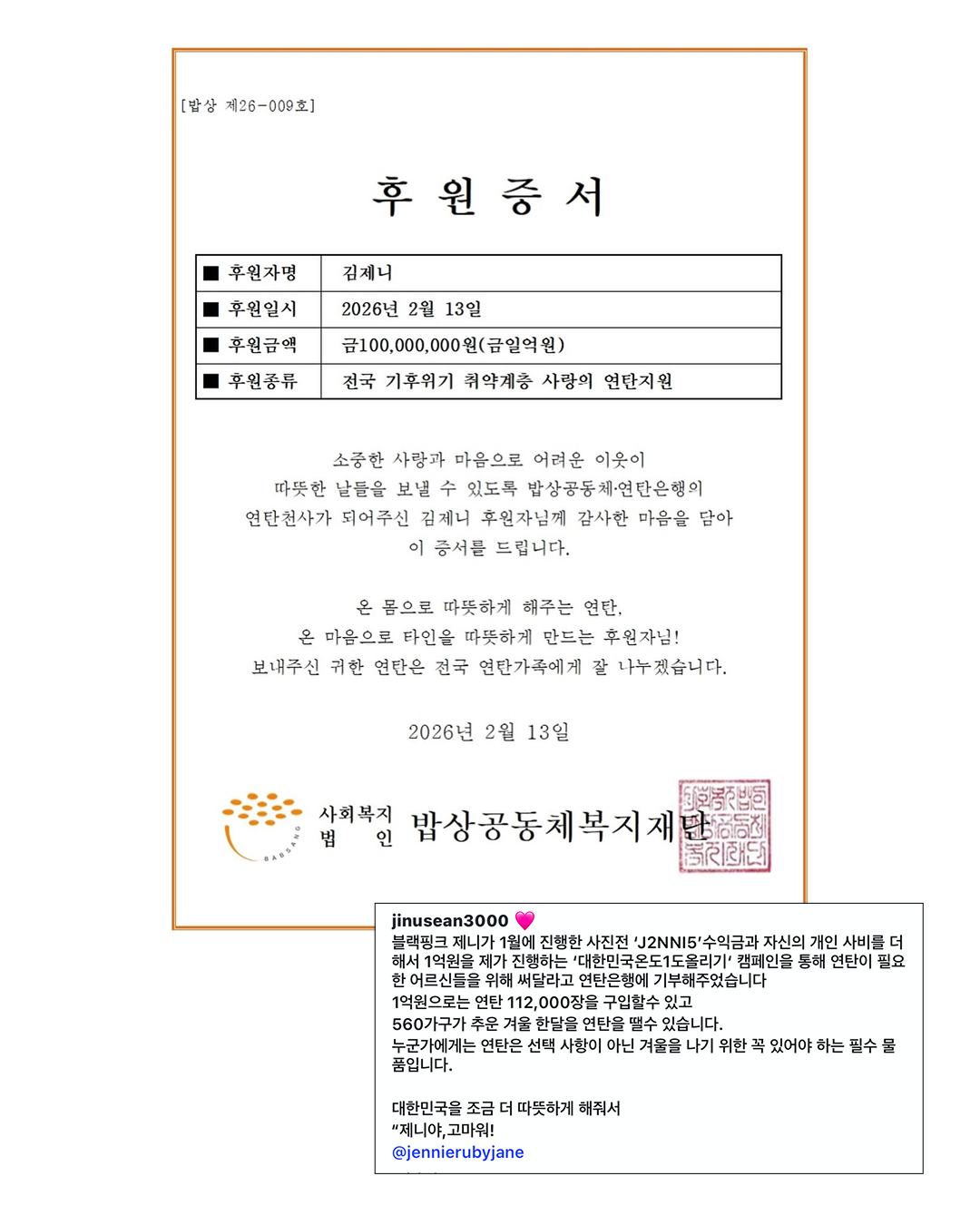 제니가 연탄 11만 2천장을 기부하며 따뜻한 나눔을 실천했습니다. 오늘 가수 션은 자신의 SNS를 통해 “제니가 1월 진행한 사진전 <J2NNI5> 수익금과 개인 사비를 더해 1억 원을 ‘대한민국온도1도올리기’ 캠페인을 통해 연탄은행에 기부했다”고 밝혔는데요.