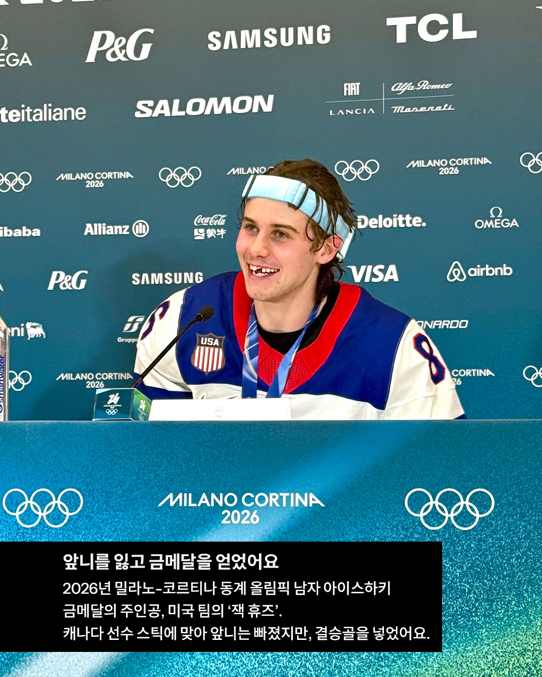 차갑지만 뜨거운 결승전 경기에서 상대편 캐나다 선수의 스틱에 맞아 앞니가 날아가버렸죠.이후 그는 인터뷰를 통해 치과 임플란트 치료를 받을 예정이라고 밝혔습니다. 금빛 임플란트가 그에게 닿기를…