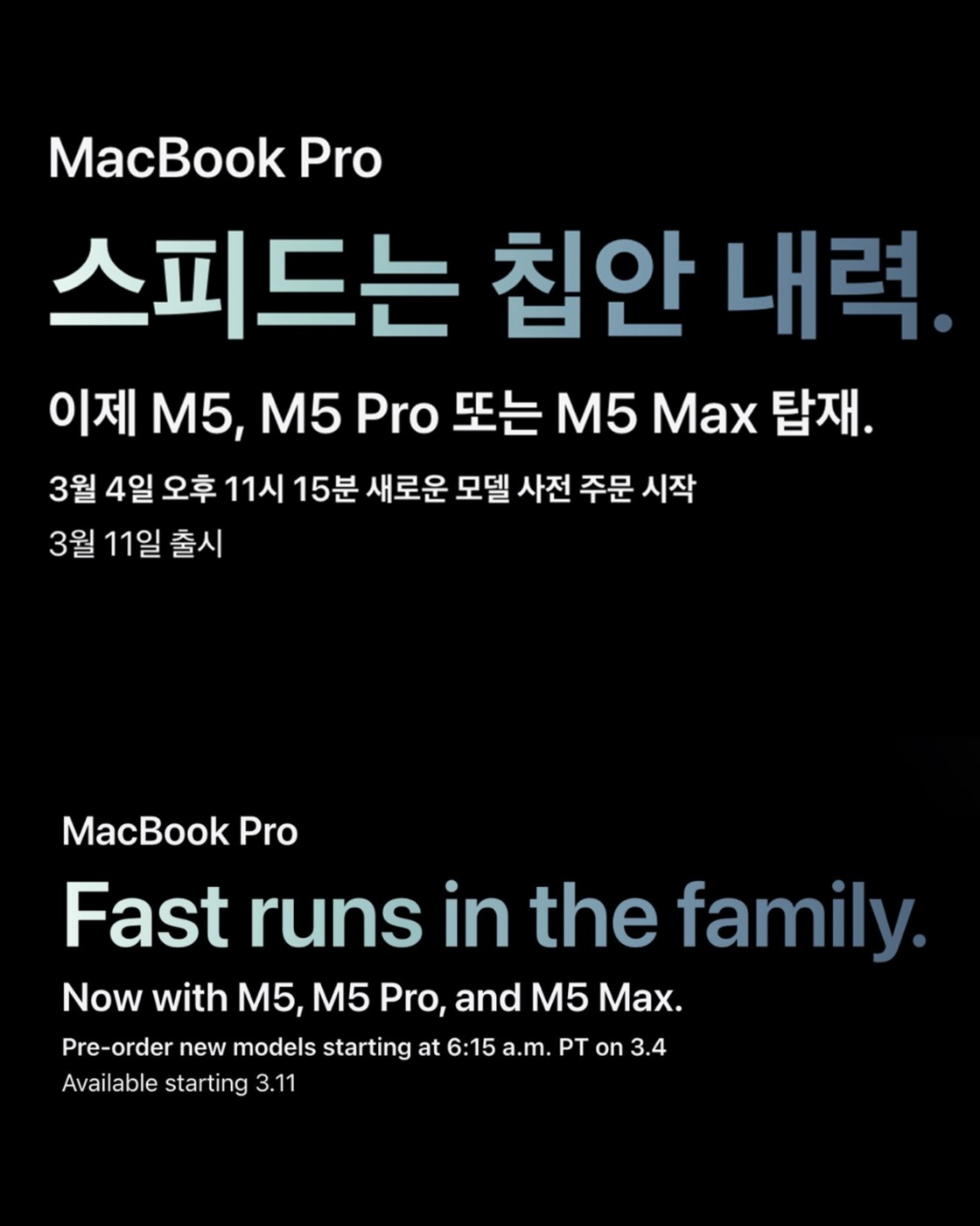 애플이 자체 설계 칩 M5 시리즈를 탑재한 신형 맥북 프로 라인업을 공개했습니다. 그런데 성능 설명보다 더 눈에 들어오는 포인트가 하나 있습니다. 이번 신형 맥북을 소개하며 사용한 영어 카피 “Fast runs in the family.”의 한국어 번역입니다. 직역하면 ‘빠른 건 집안 내력’ 정도의 의미인데요.